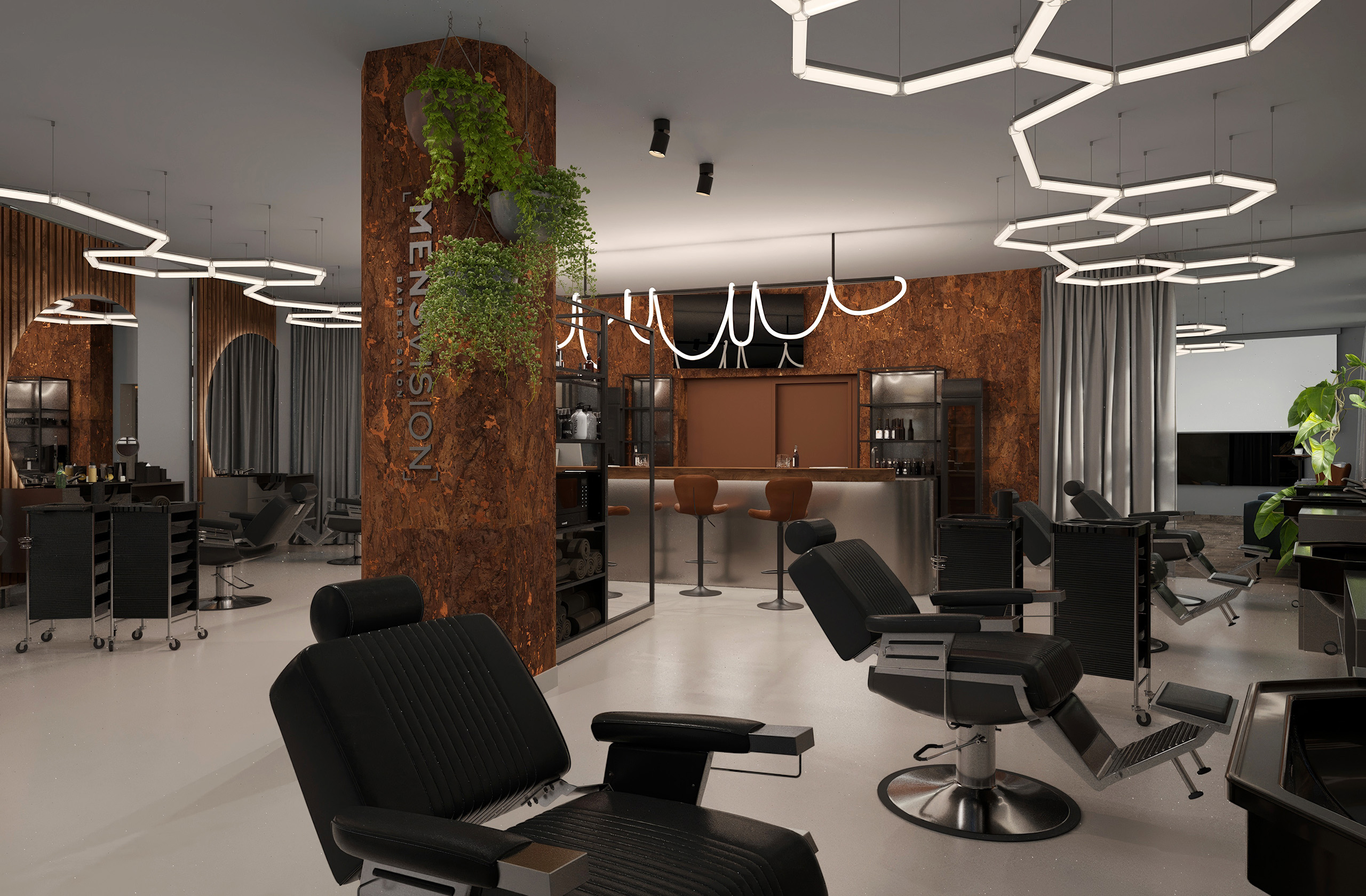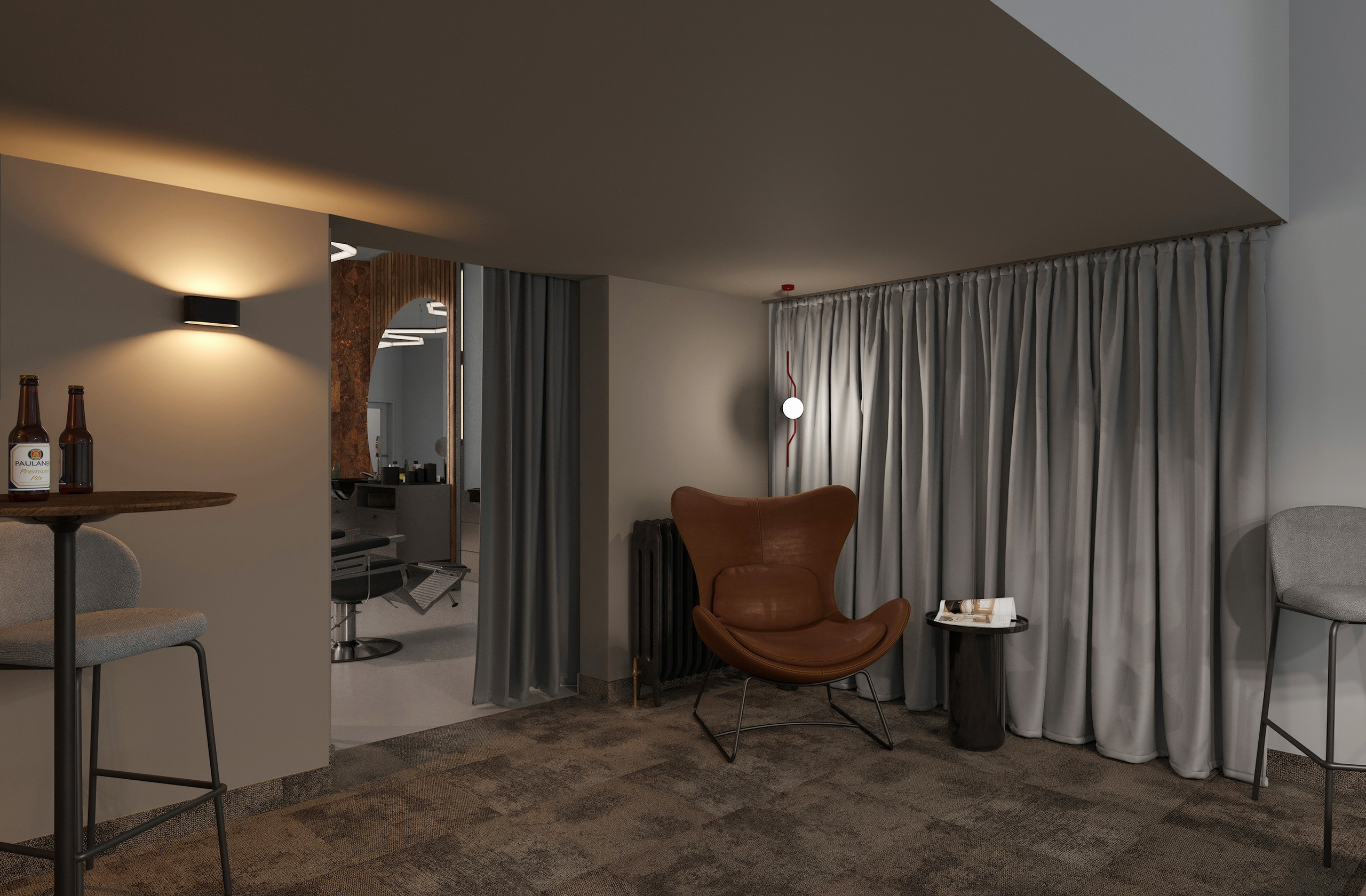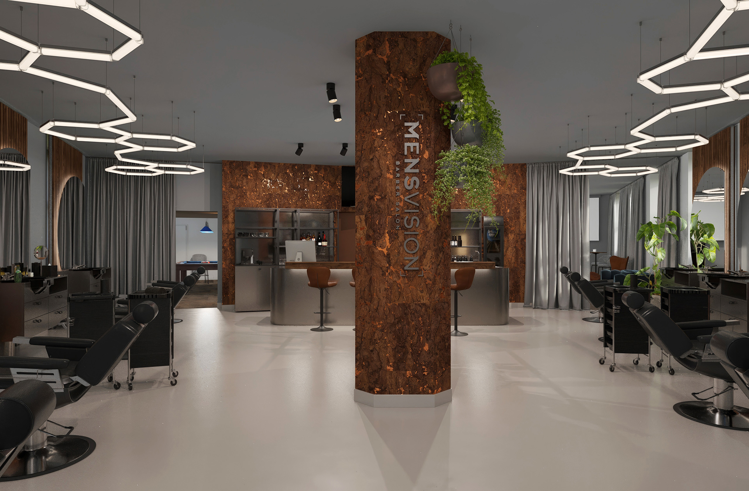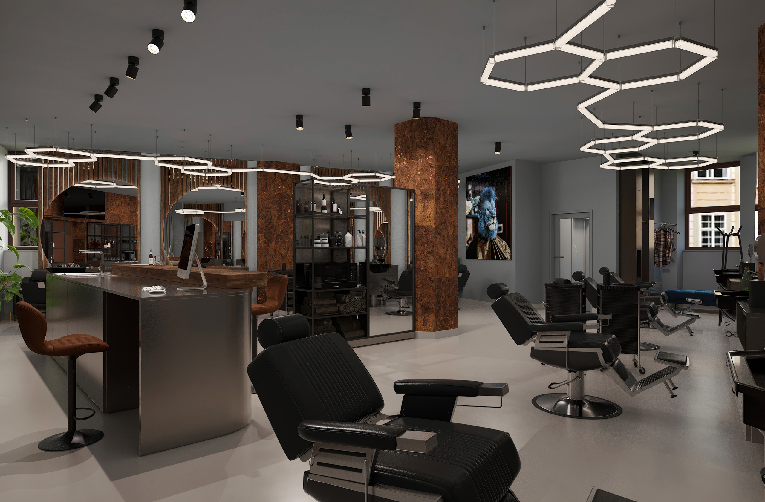 Opět jsme byli oslovení pro tvorbu nově vznikající pobočky pánského kadeřnictví a holičství, které vzniká v Ostravě. Požadavkem bylo zachování již funkčního konceptu šedých barev, osvětlení, betonové podlahy. Pro větší pocit z luxusu, jsme zvolili prvek tapety, která v reálu zateplí a zjemní studený charakter kovu a barev. Majitel si přál vytvořit více prostoru pro odpočinek svých hostů formou kulečníku, posezení a místem pro dětský doprovod. Koberce v těchto zónách kontrastují s hlavním prostorem stříhací zóny. Velkoformátové obrazy dodají celému konceptu barevnost a energii.