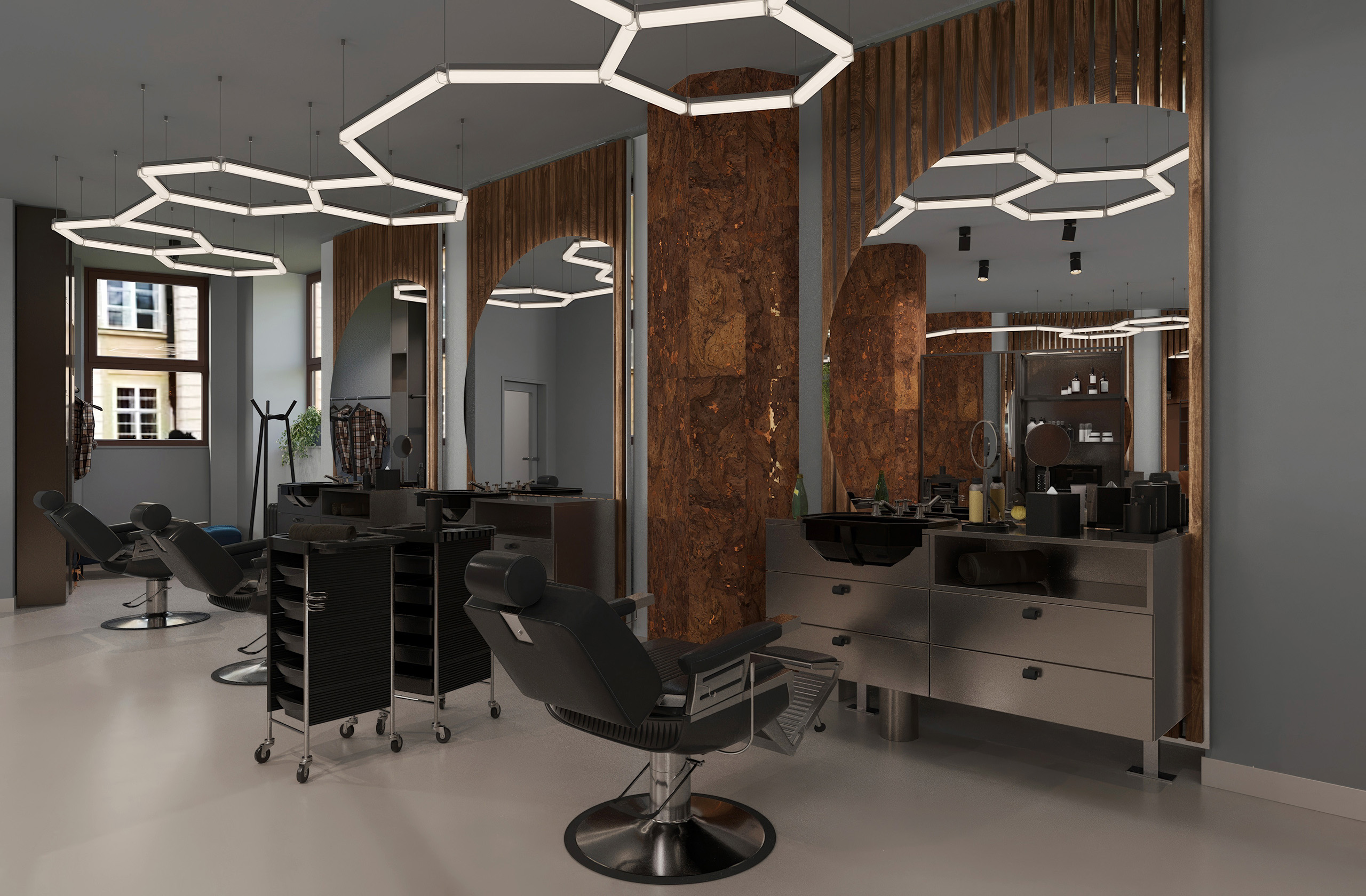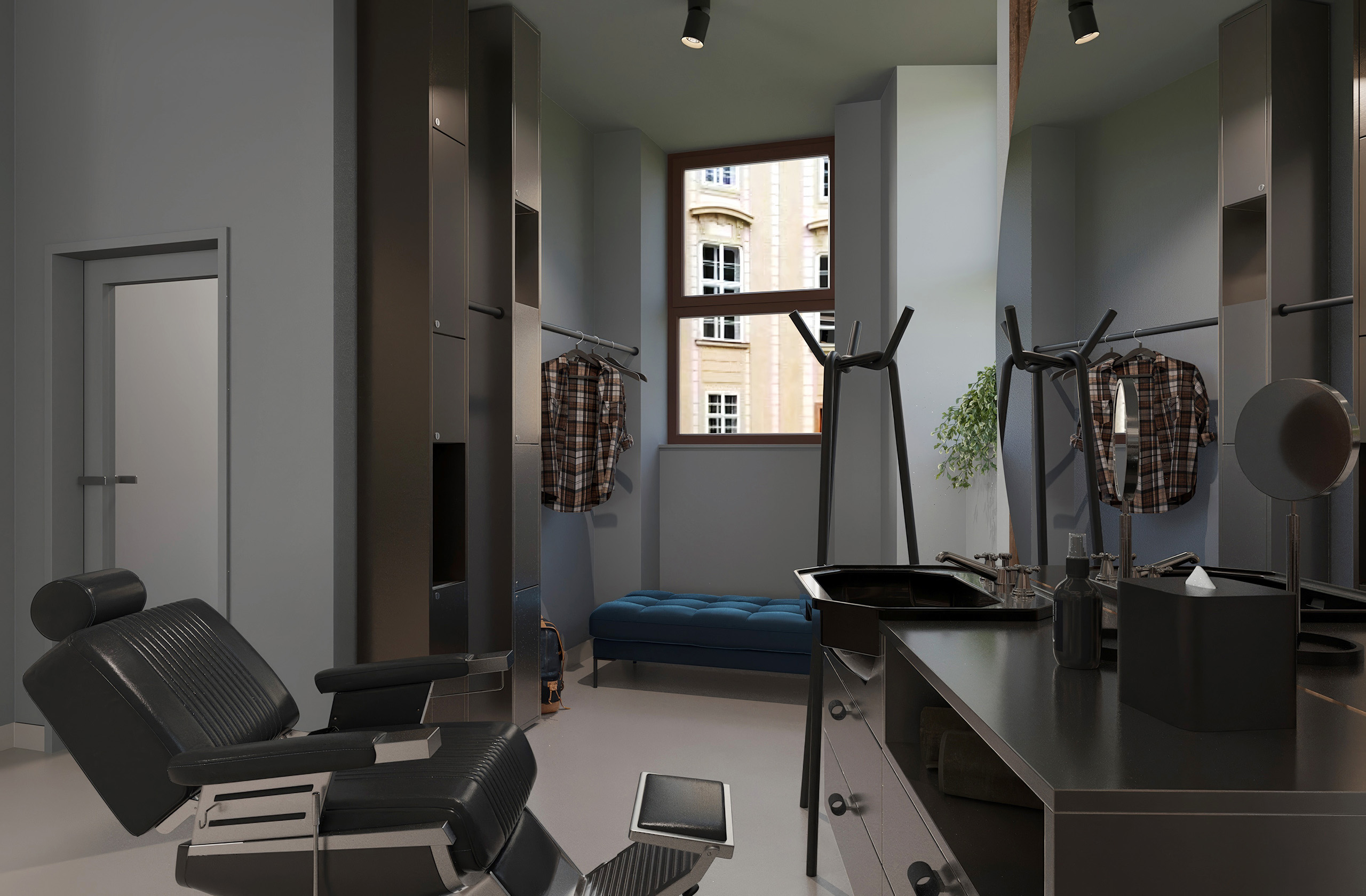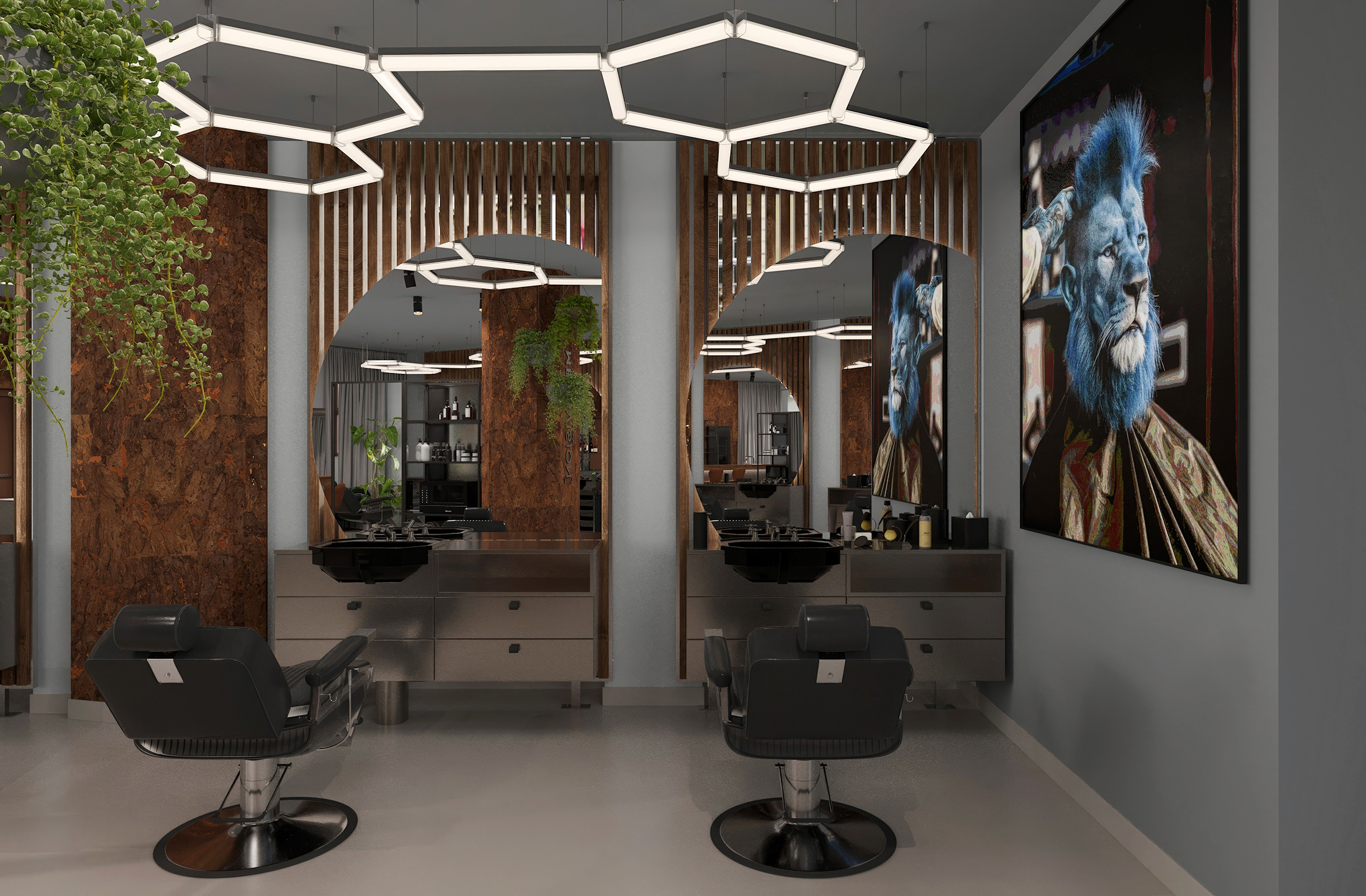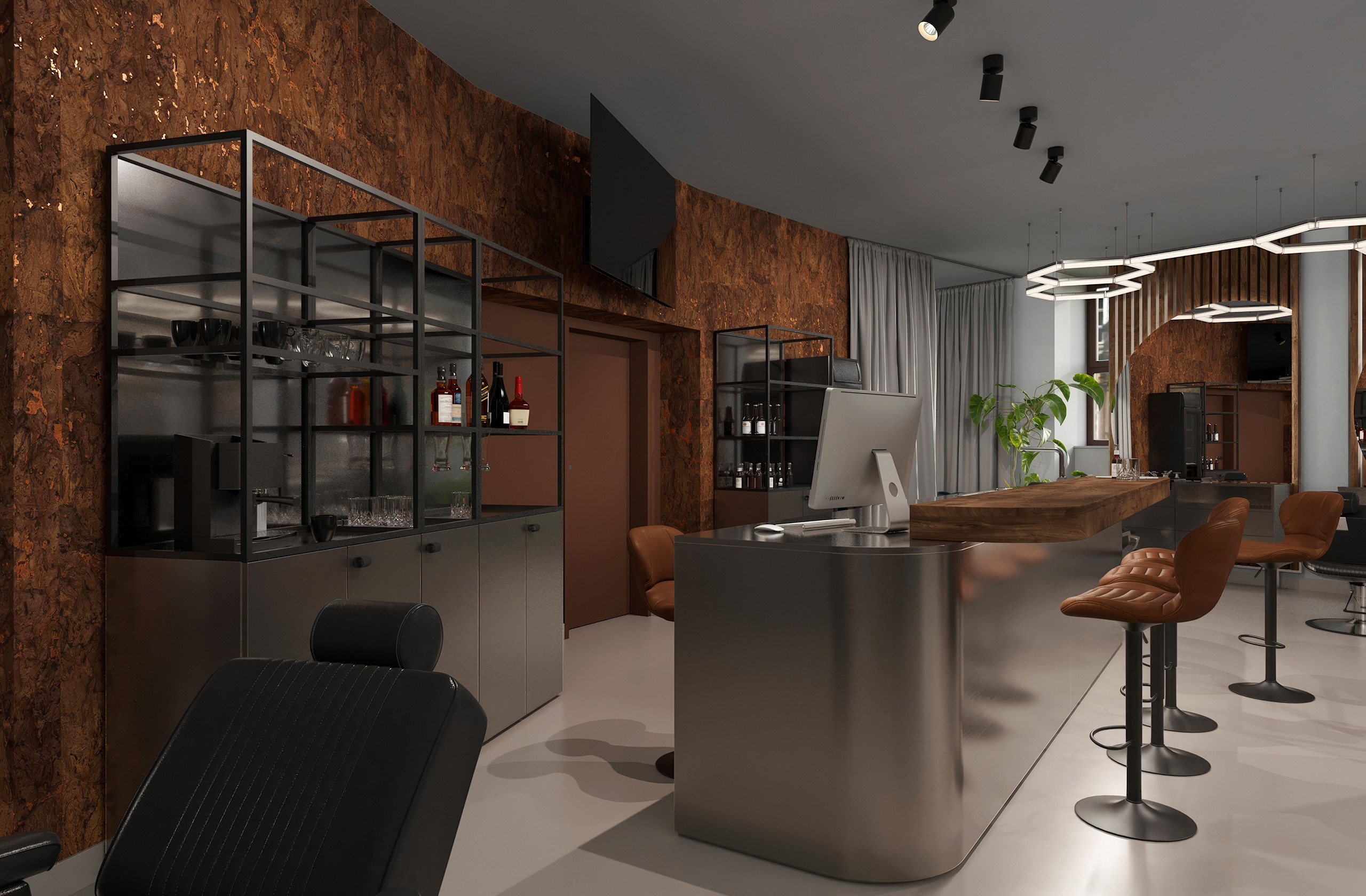 Opět jsme byli oslovení pro tvorbu nově vznikající pobočky pánského kadeřnictví a holičství, které vzniká v Ostravě. Požadavkem bylo zachování již funkčního konceptu šedých barev, osvětlení, betonové podlahy. Pro větší pocit z luxusu, jsme zvolili prvek tapety, která v reálu zateplí a zjemní studený charakter kovu a barev. Majitel si přál vytvořit více prostoru pro odpočinek svých hostů formou kulečníku, posezení a místem pro dětský doprovod. Koberce v těchto zónách kontrastují s hlavním prostorem stříhací zóny. Velkoformátové obrazy dodají celému konceptu barevnost a energii.