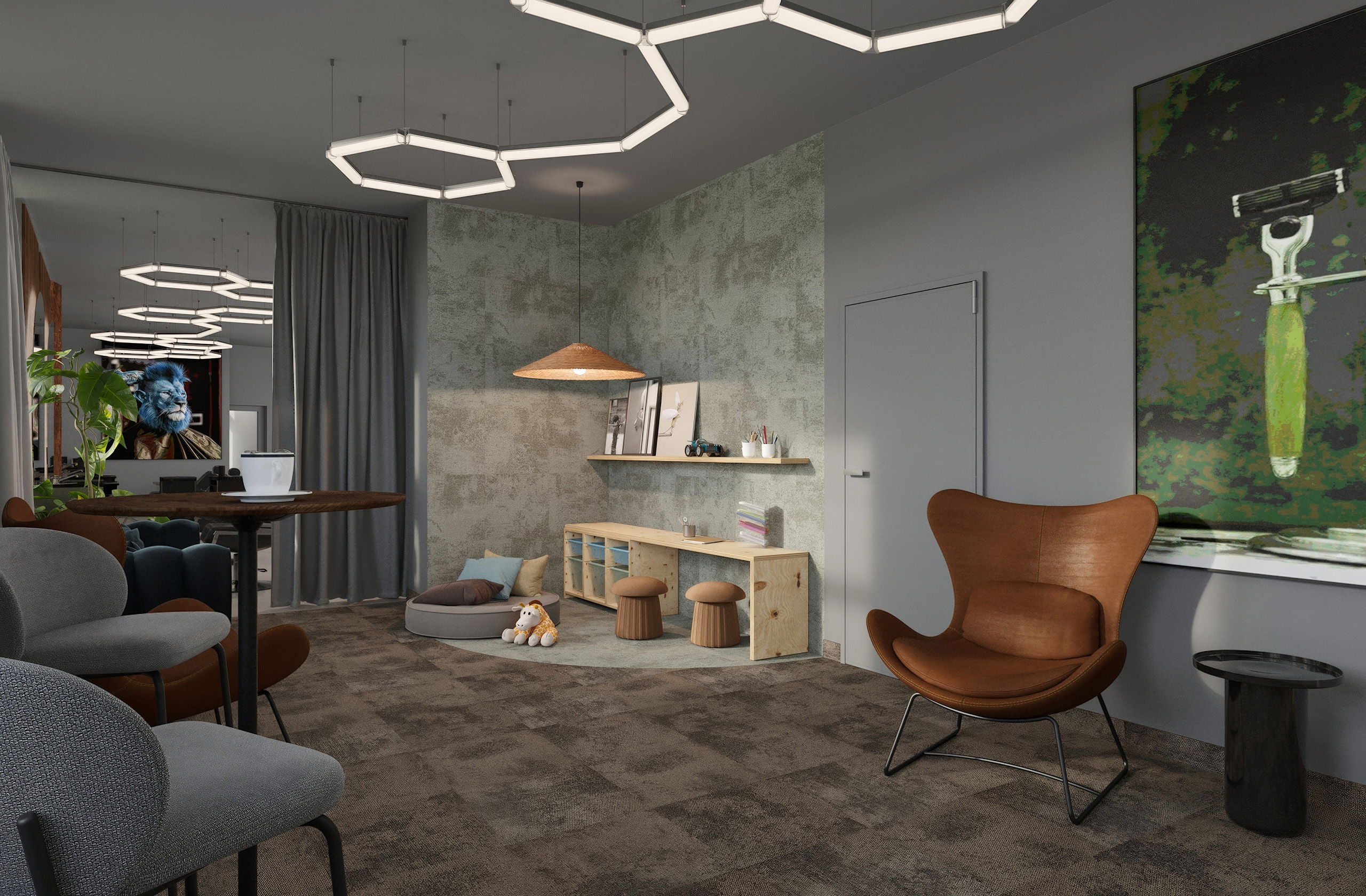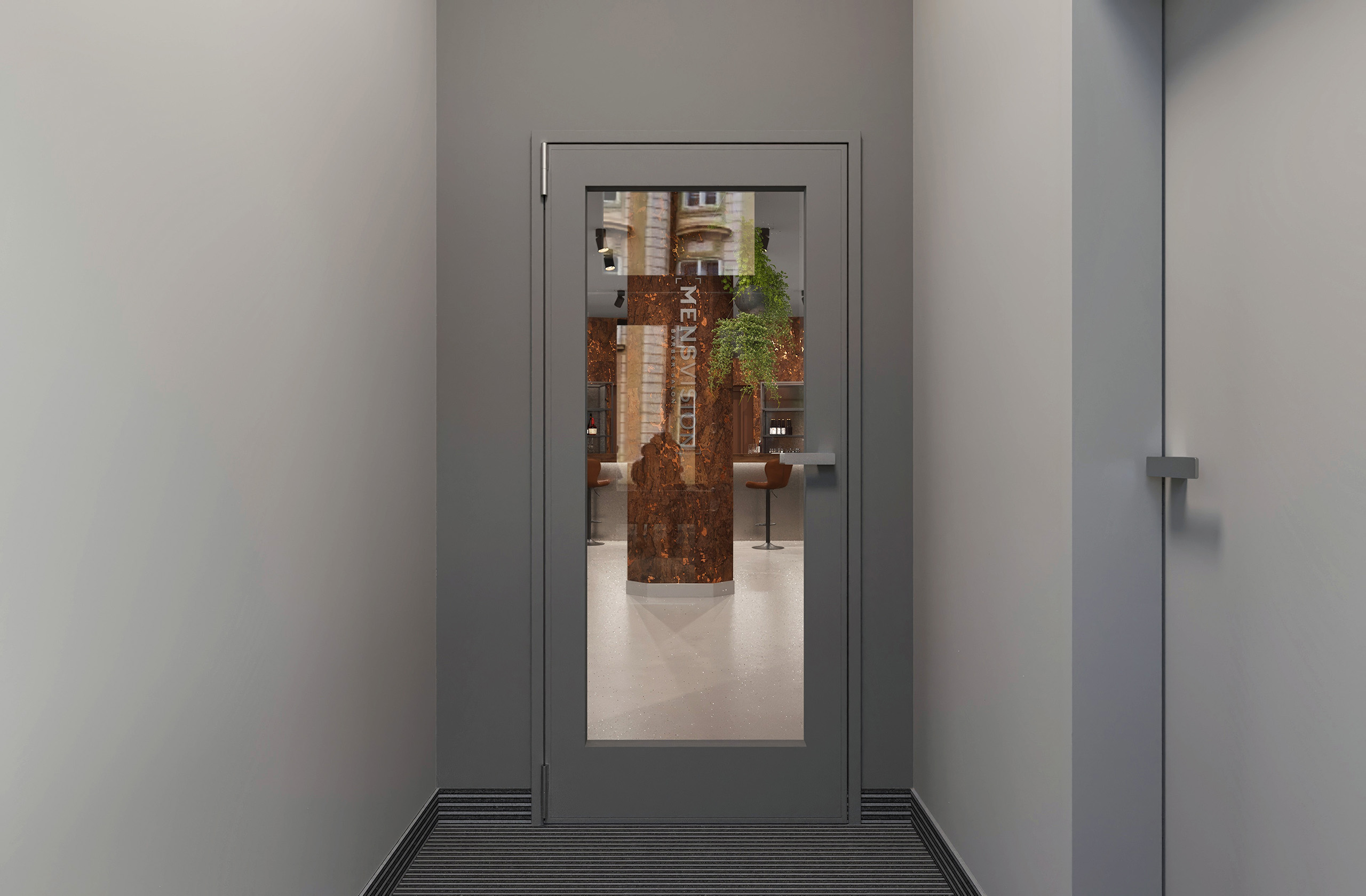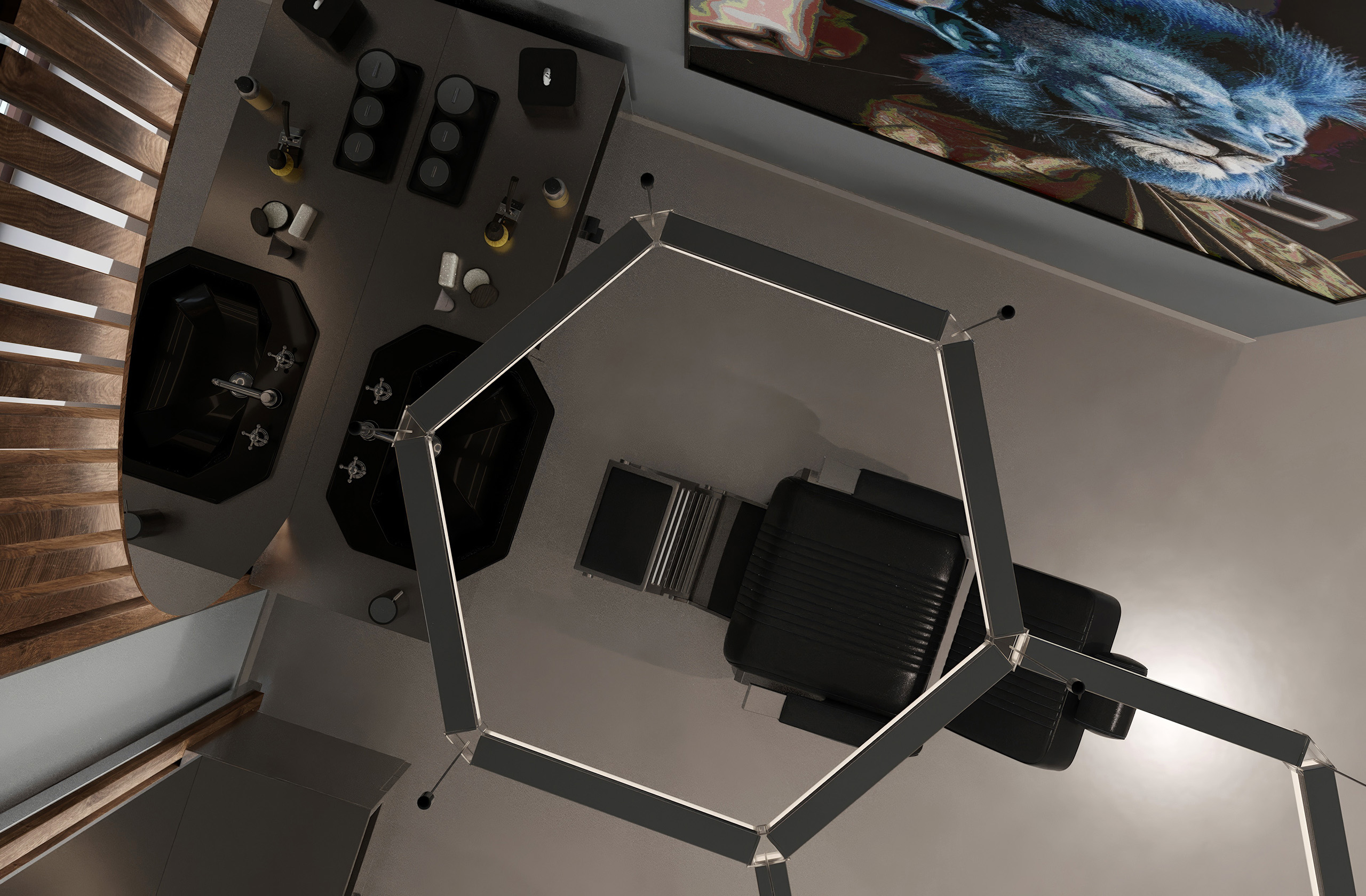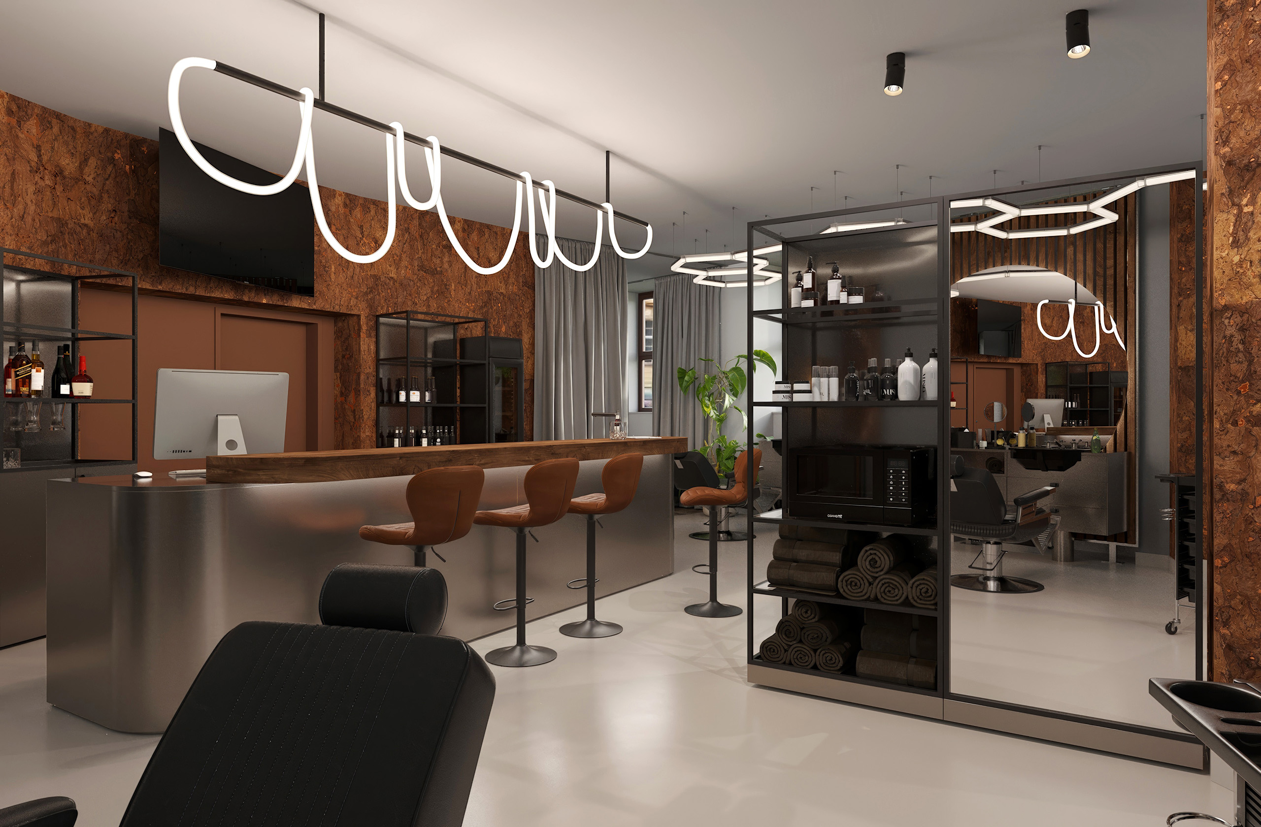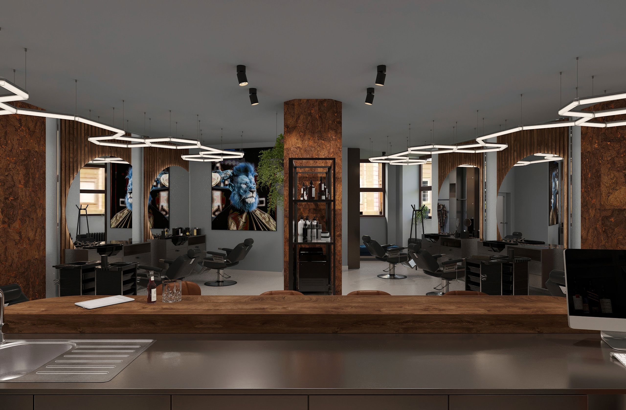 Opět jsme byli oslovení pro tvorbu nově vznikající pobočky pánského kadeřnictví a holičství, které vzniká v Ostravě. Požadavkem bylo zachování již funkčního konceptu šedých barev, osvětlení, betonové podlahy. Pro větší pocit z luxusu, jsme zvolili prvek tapety, která v reálu zateplí a zjemní studený charakter kovu a barev. Majitel si přál vytvořit více prostoru pro odpočinek svých hostů formou kulečníku, posezení a místem pro dětský doprovod. Koberce v těchto zónách kontrastují s hlavním prostorem stříhací zóny. Velkoformátové obrazy dodají celému konceptu barevnost a energii.