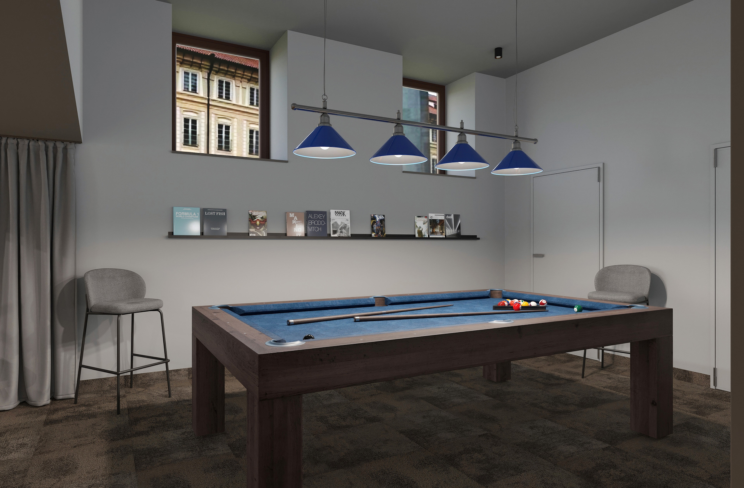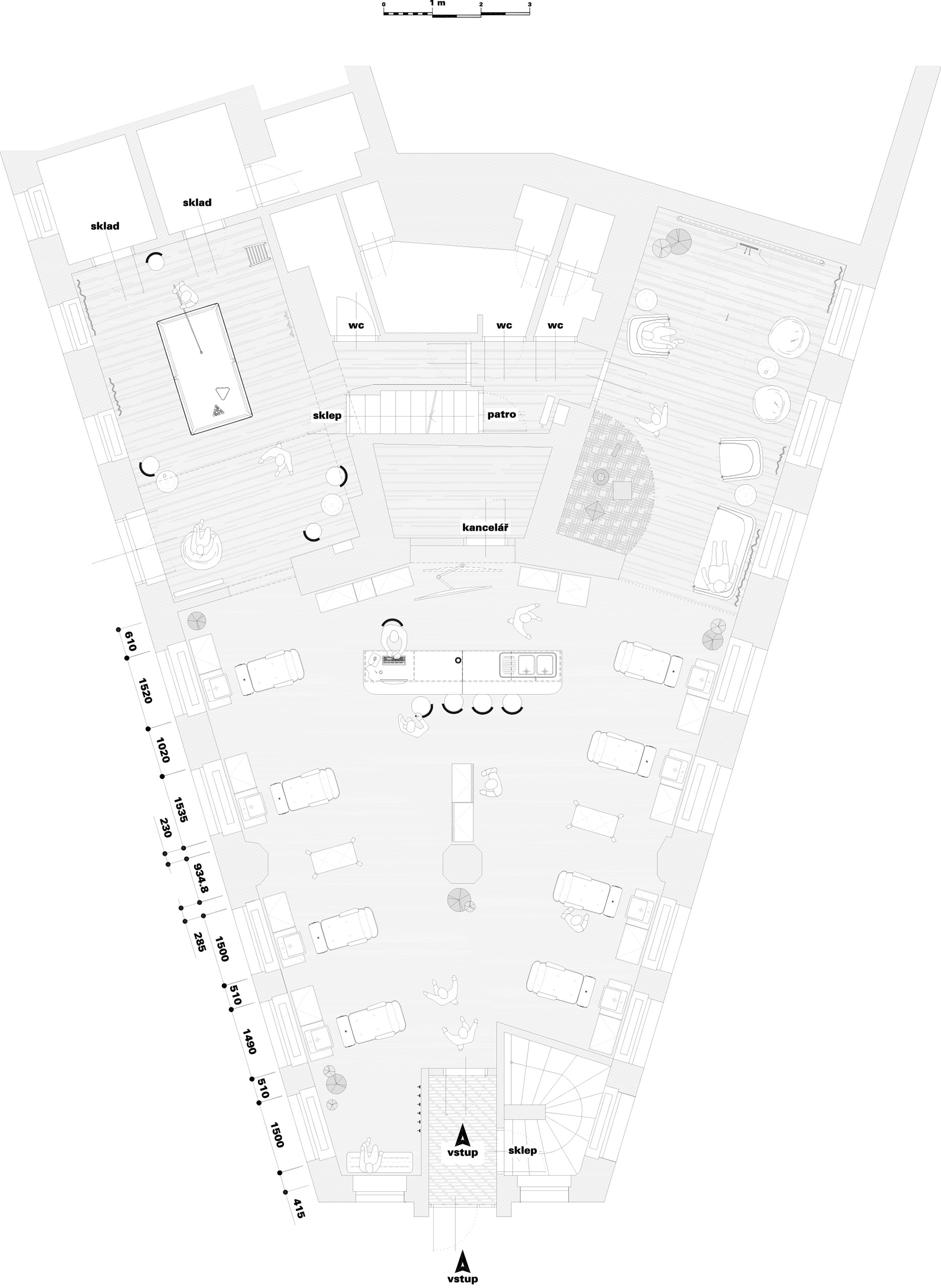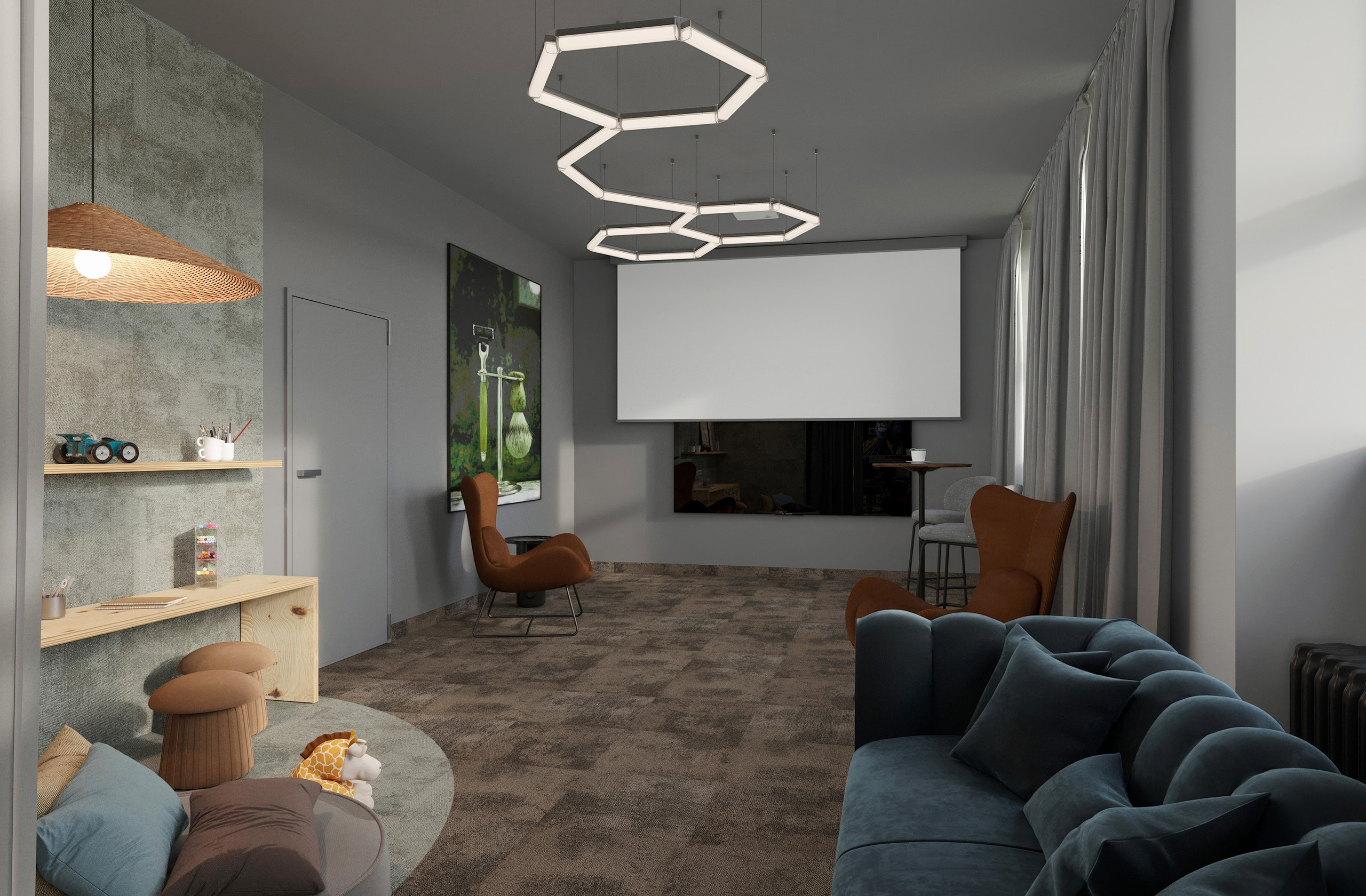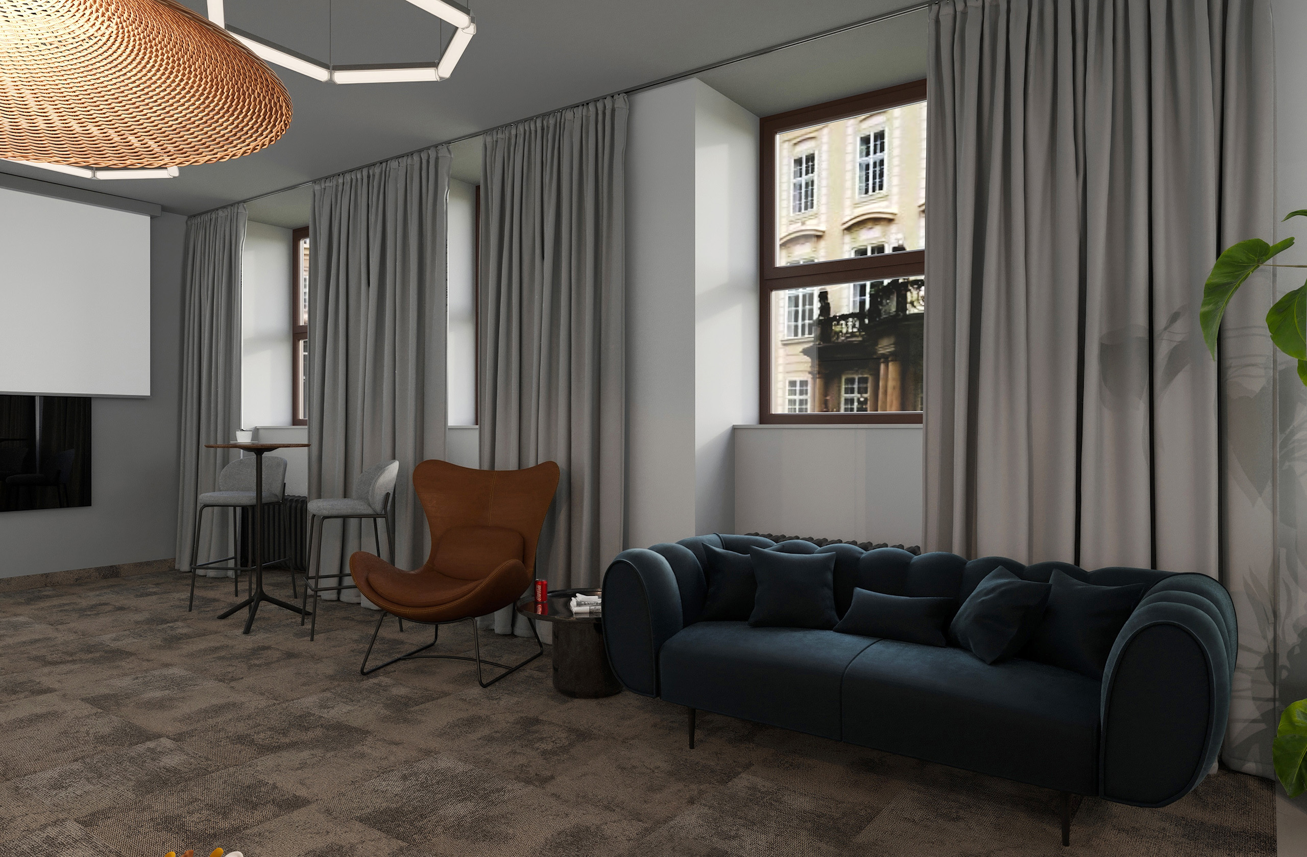 Opět jsme byli oslovení pro tvorbu nově vznikající pobočky pánského kadeřnictví a holičství, které vzniká v Ostravě. Požadavkem bylo zachování již funkčního konceptu šedých barev, osvětlení, betonové podlahy. Pro větší pocit z luxusu, jsme zvolili prvek tapety, která v reálu zateplí a zjemní studený charakter kovu a barev. Majitel si přál vytvořit více prostoru pro odpočinek svých hostů formou kulečníku, posezení a místem pro dětský doprovod. Koberce v těchto zónách kontrastují s hlavním prostorem stříhací zóny. Velkoformátové obrazy dodají celému konceptu barevnost a energii.