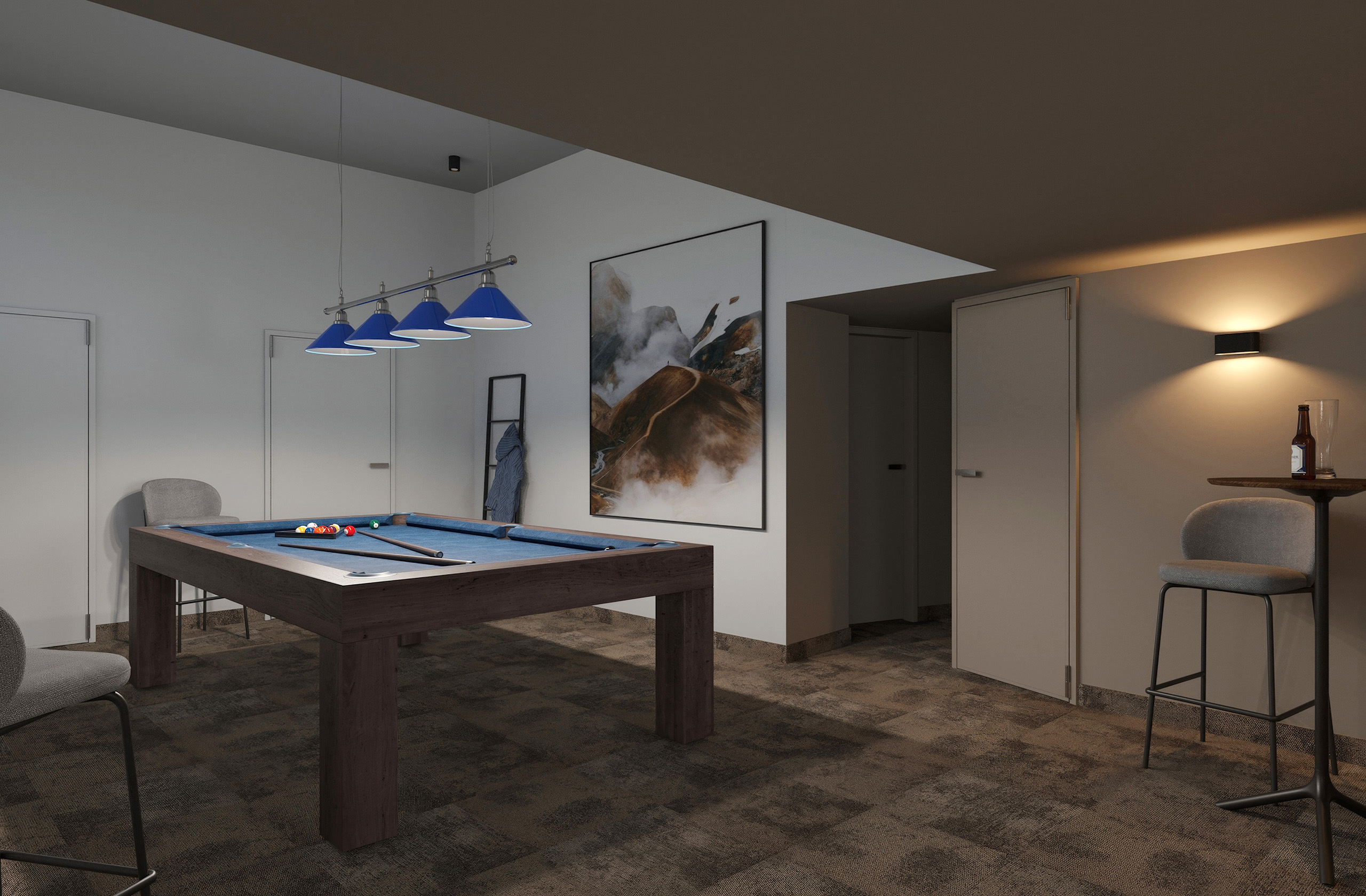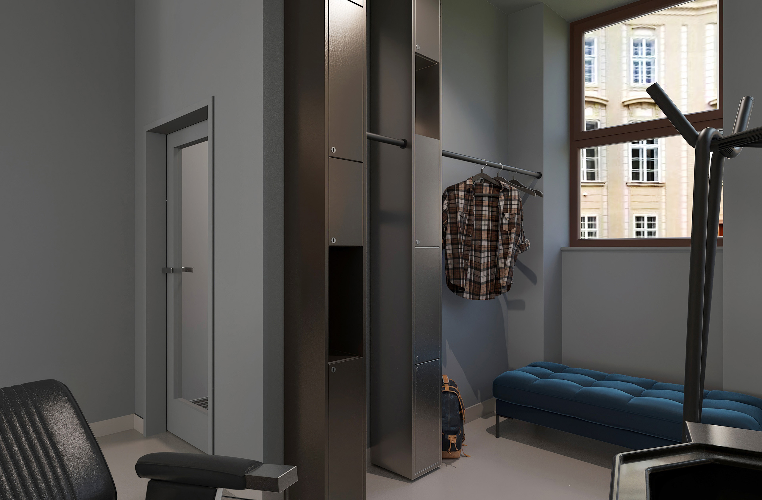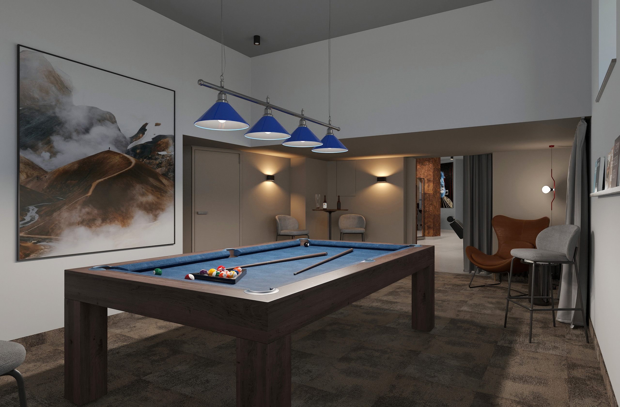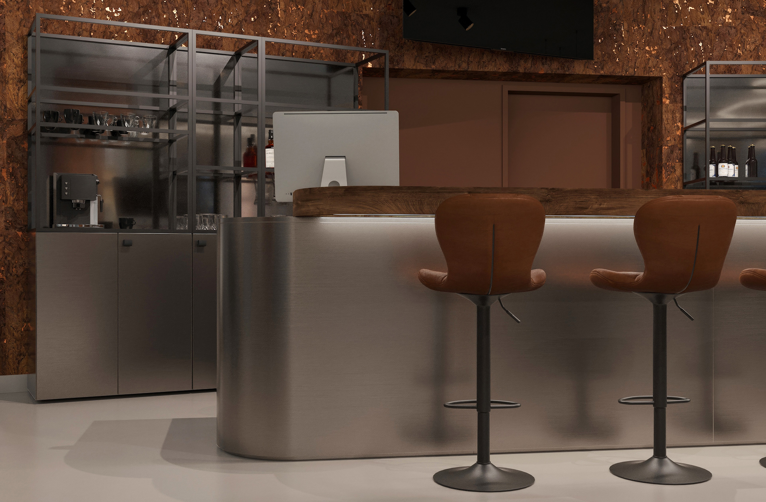 Opět jsme byli oslovení pro tvorbu nově vznikající pobočky pánského kadeřnictví a holičství, které vzniká v Ostravě. Požadavkem bylo zachování již funkčního konceptu šedých barev, osvětlení, betonové podlahy. Pro větší pocit z luxusu, jsme zvolili prvek tapety, která v reálu zateplí a zjemní studený charakter kovu a barev. Majitel si přál vytvořit více prostoru pro odpočinek svých hostů formou kulečníku, posezení a místem pro dětský doprovod. Koberce v těchto zónách kontrastují s hlavním prostorem stříhací zóny. Velkoformátové obrazy dodají celému konceptu barevnost a energii.