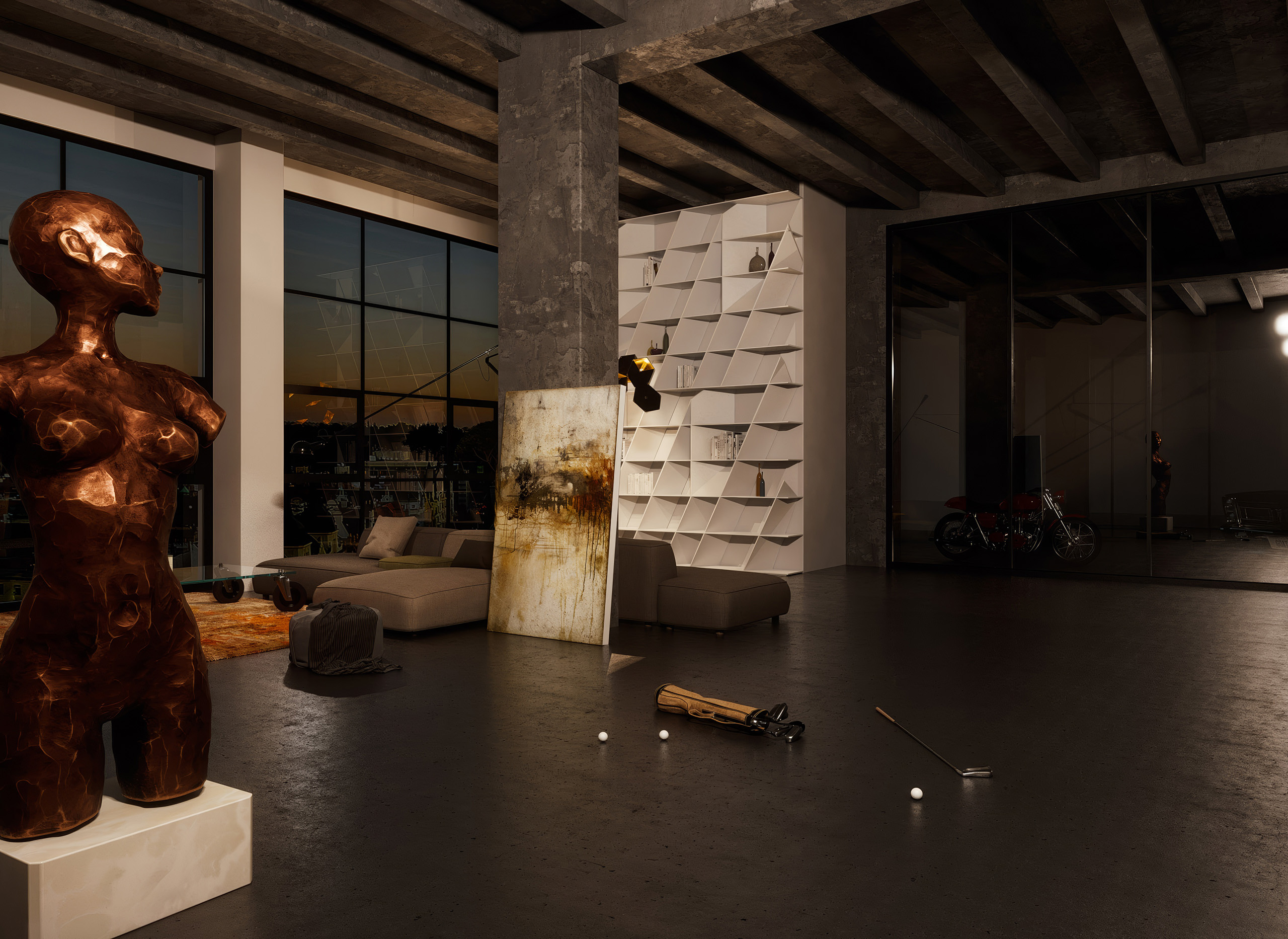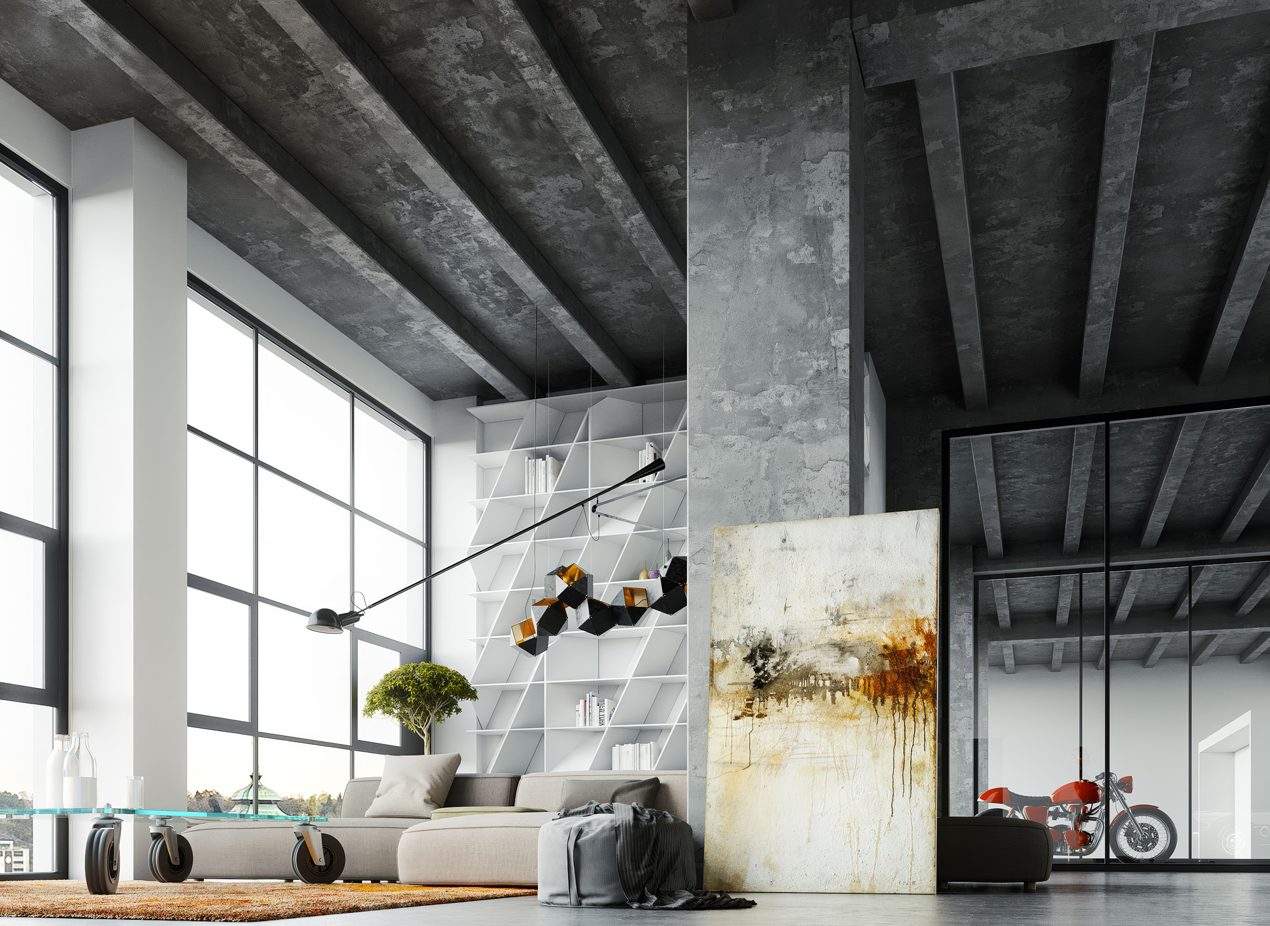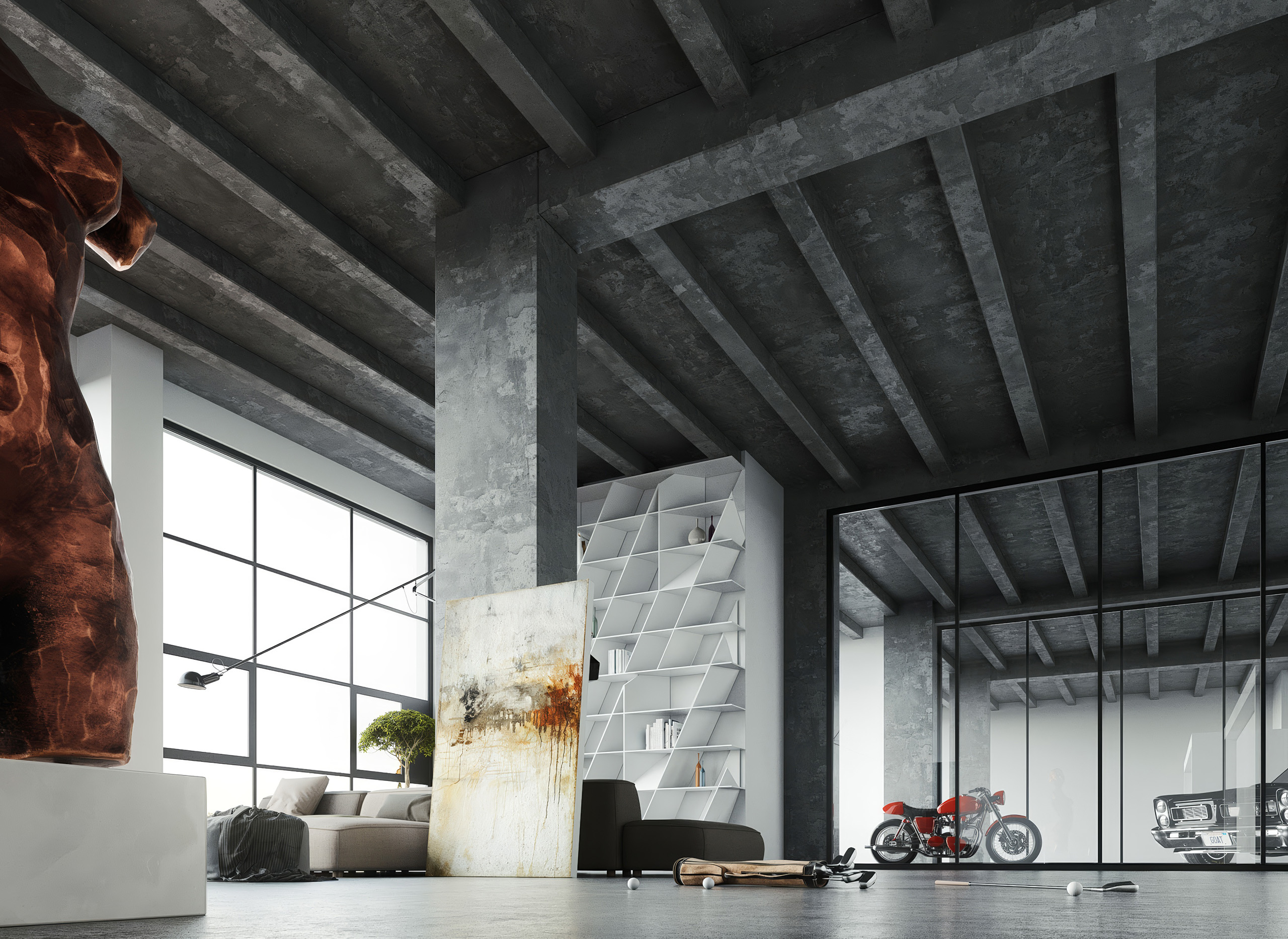 Nevšední loftový byt v prostorách bývalé továrny imitující industriální styl daného prostoru.