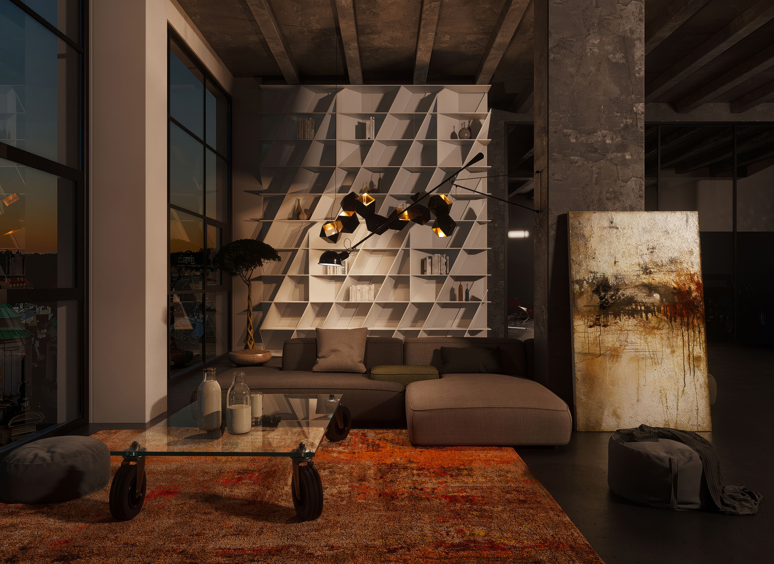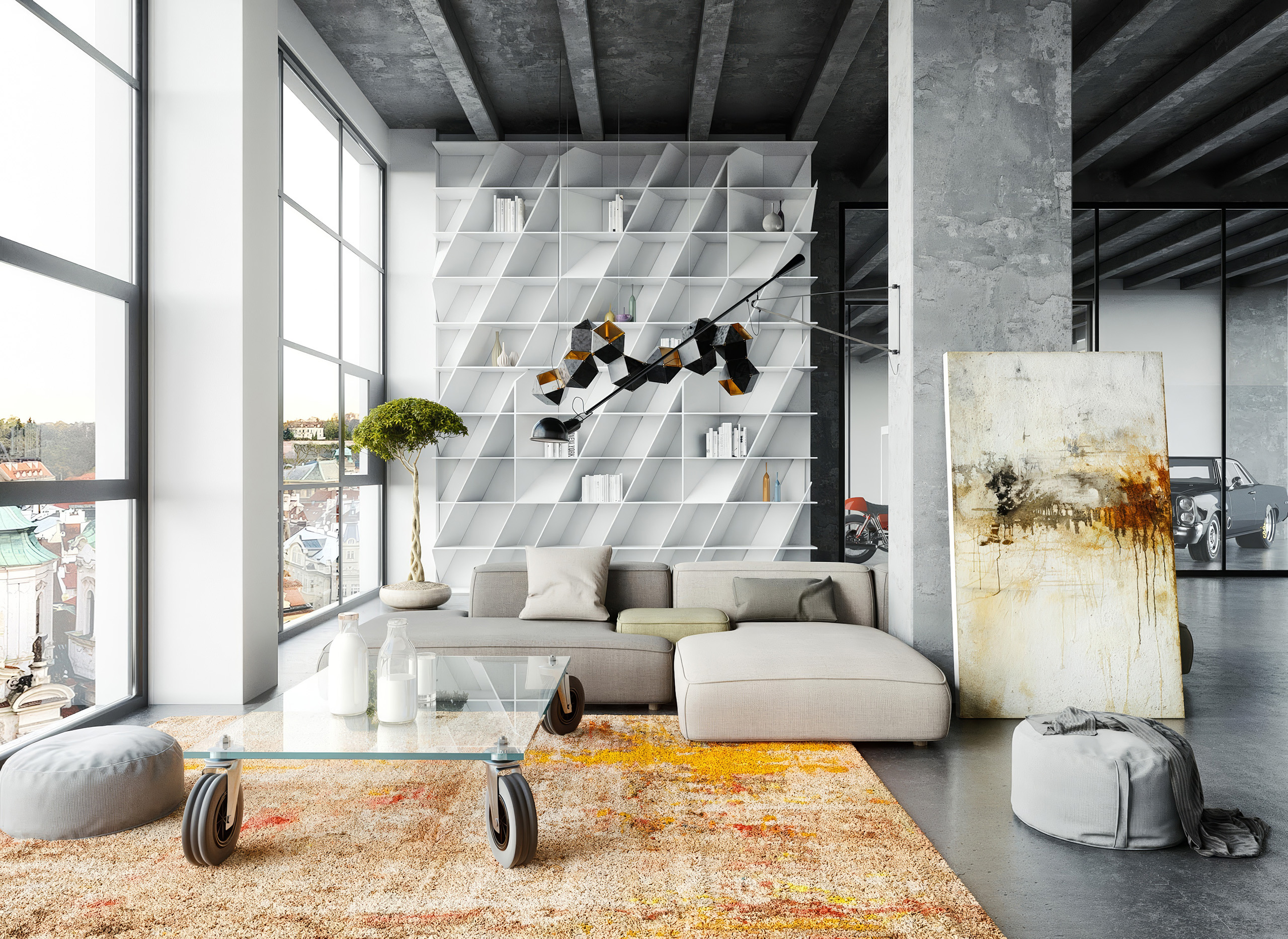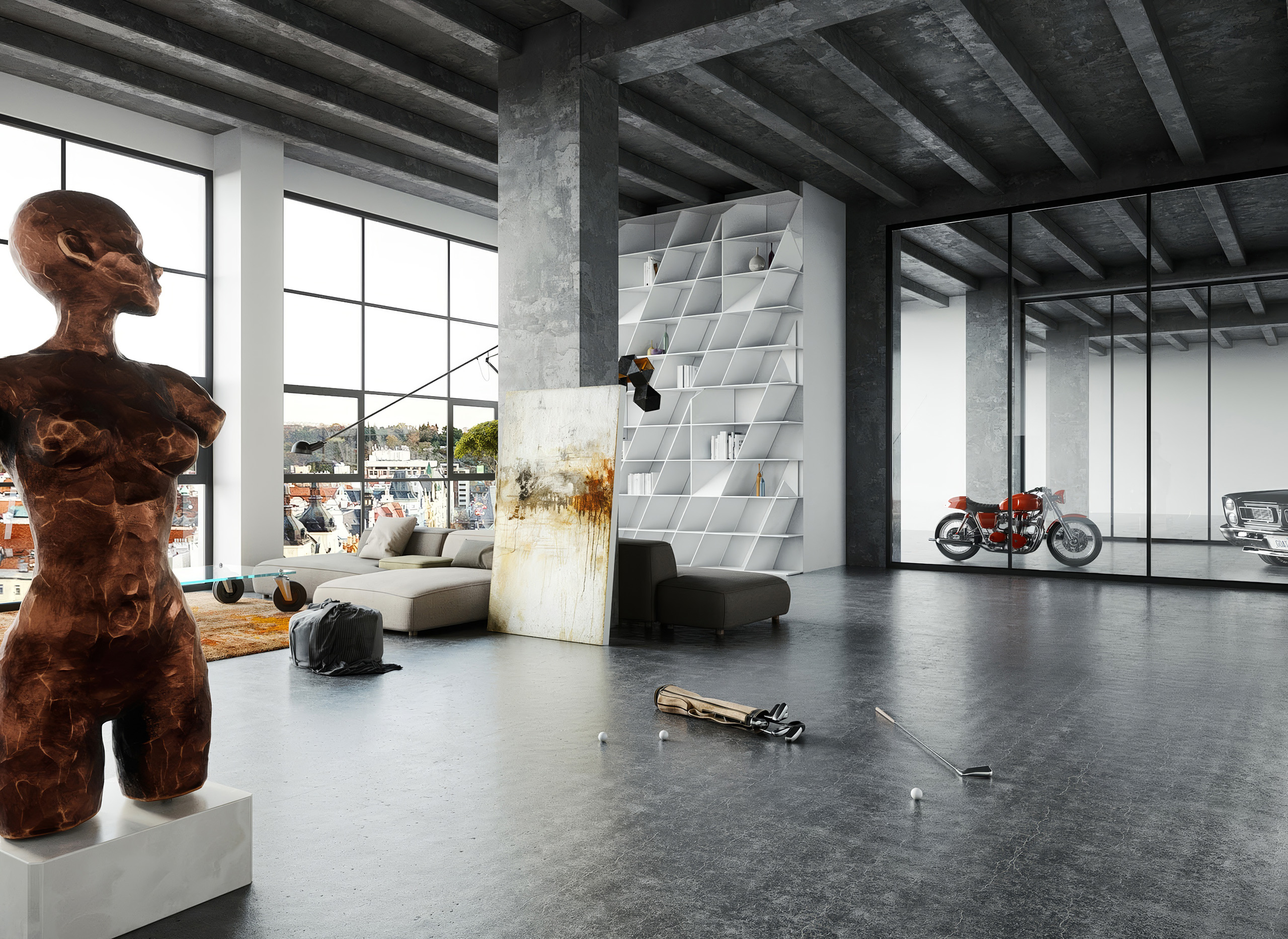 Nevšední loftový byt v prostorách bývalé továrny imitující industriální styl daného prostoru.