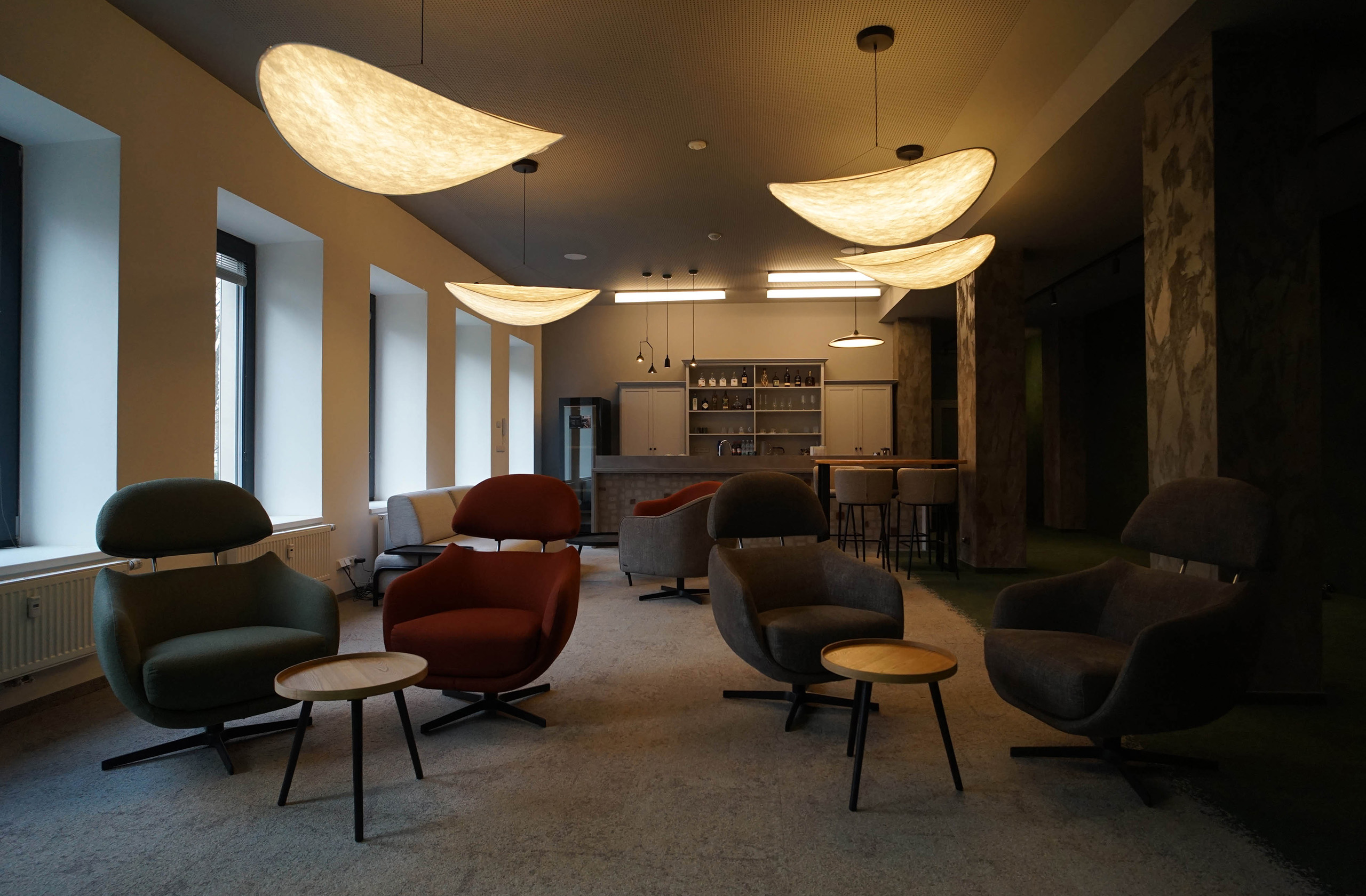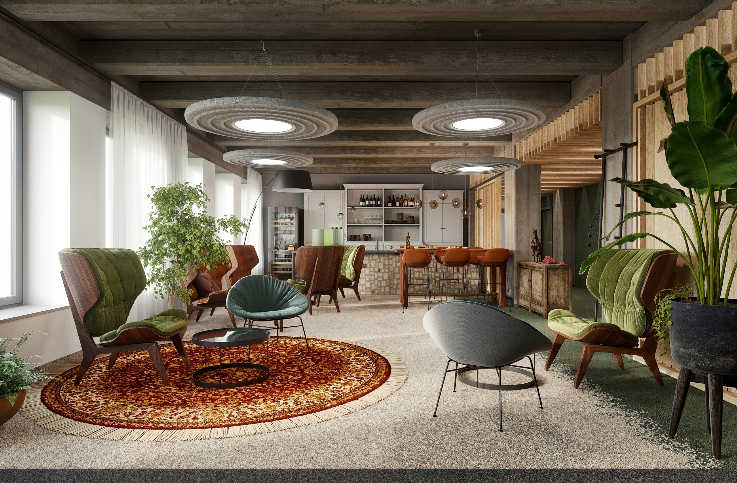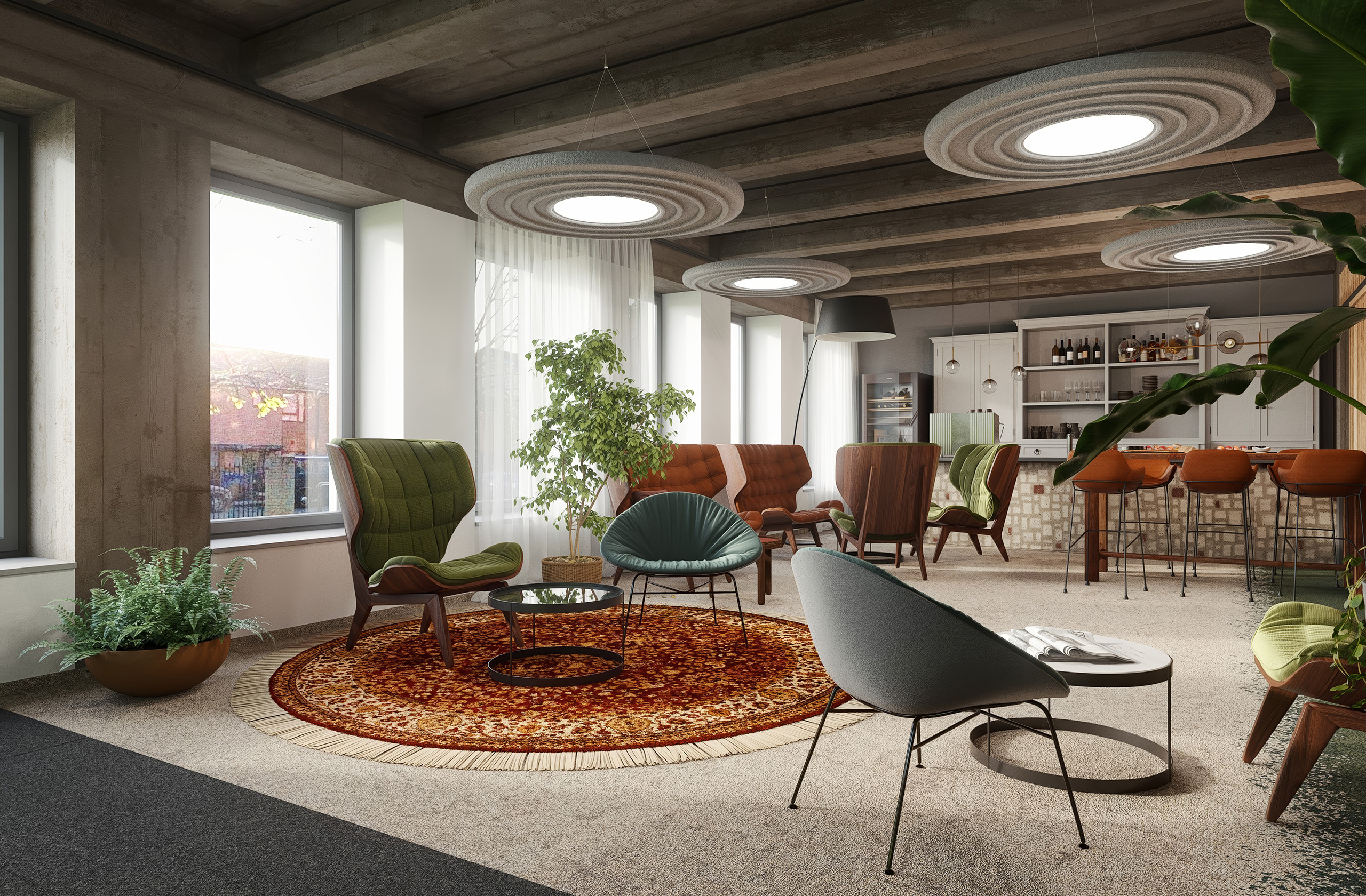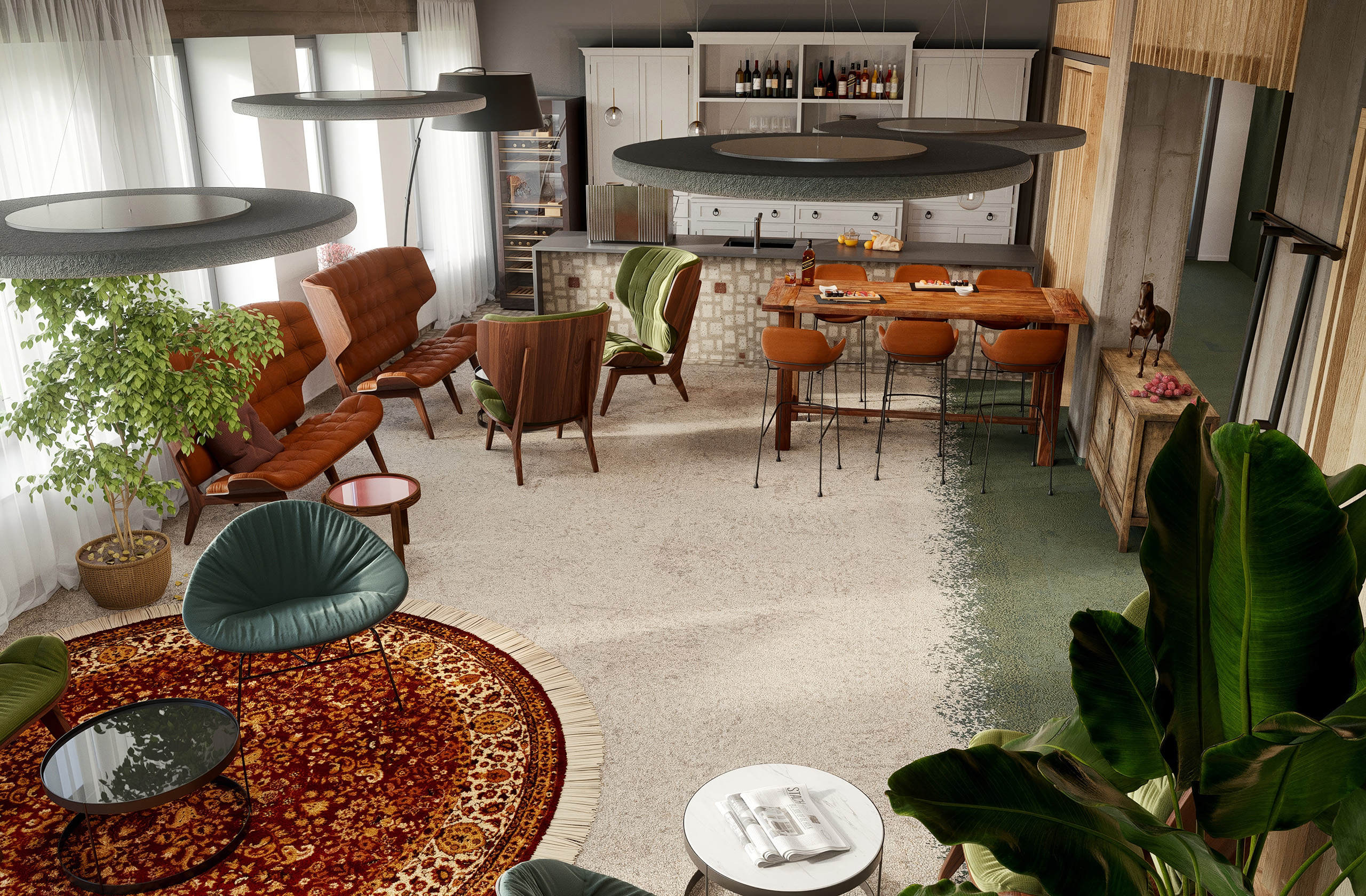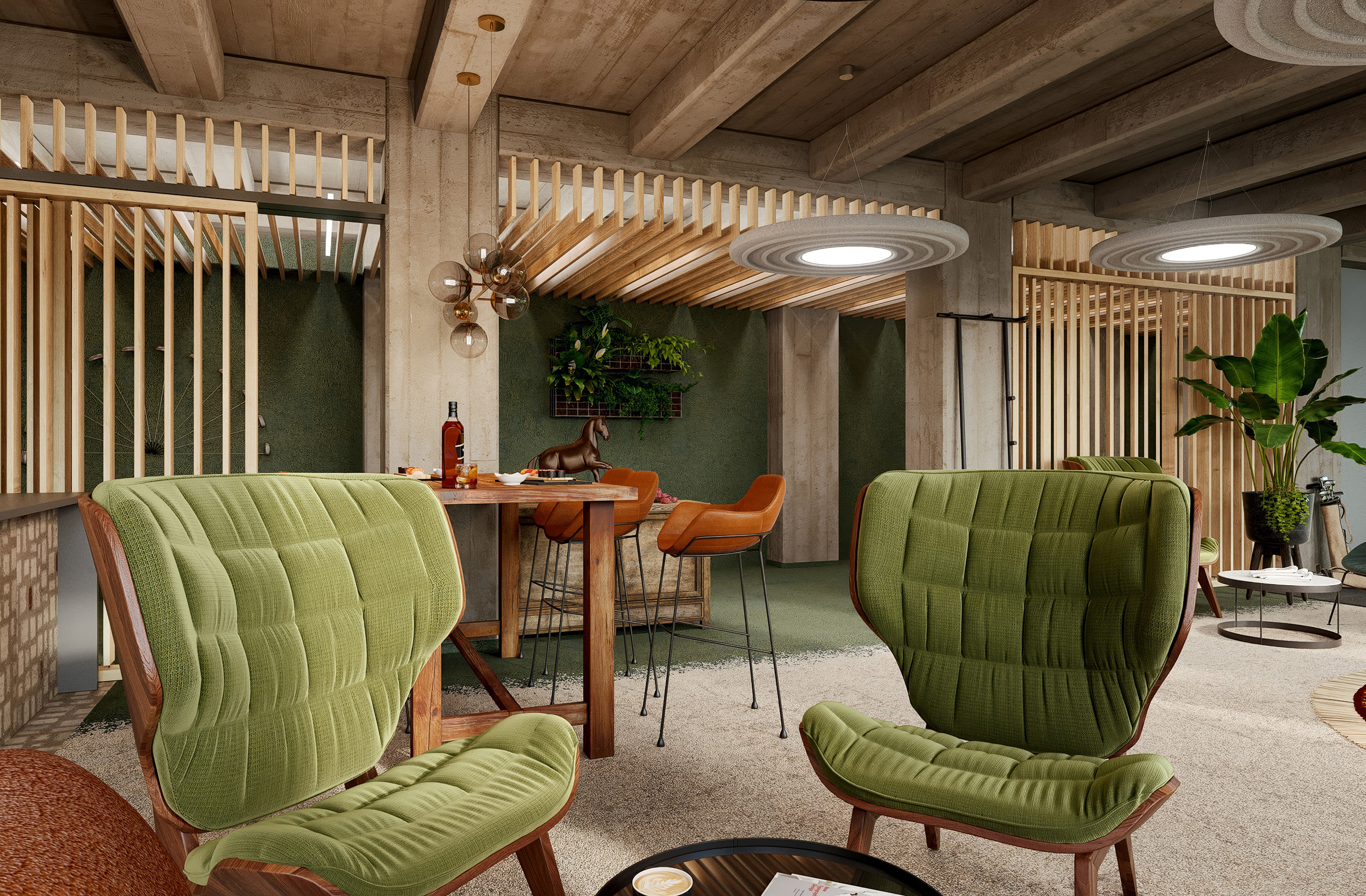 Koberce evokující zelený trávník, klubové posezení, měkké osvětlení a zdobnější bar, zůtulňují industriální prostory s betonovými podhledy a sloupy.