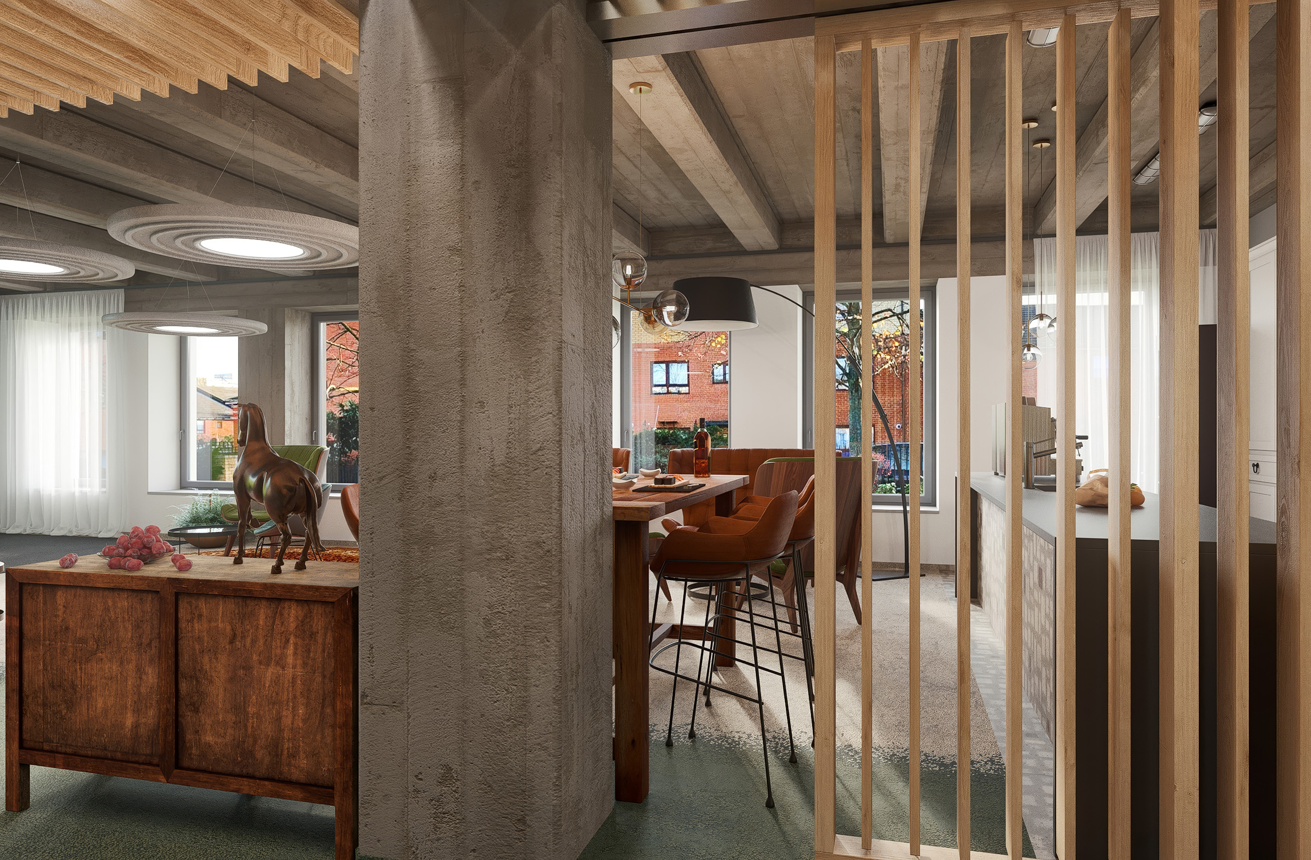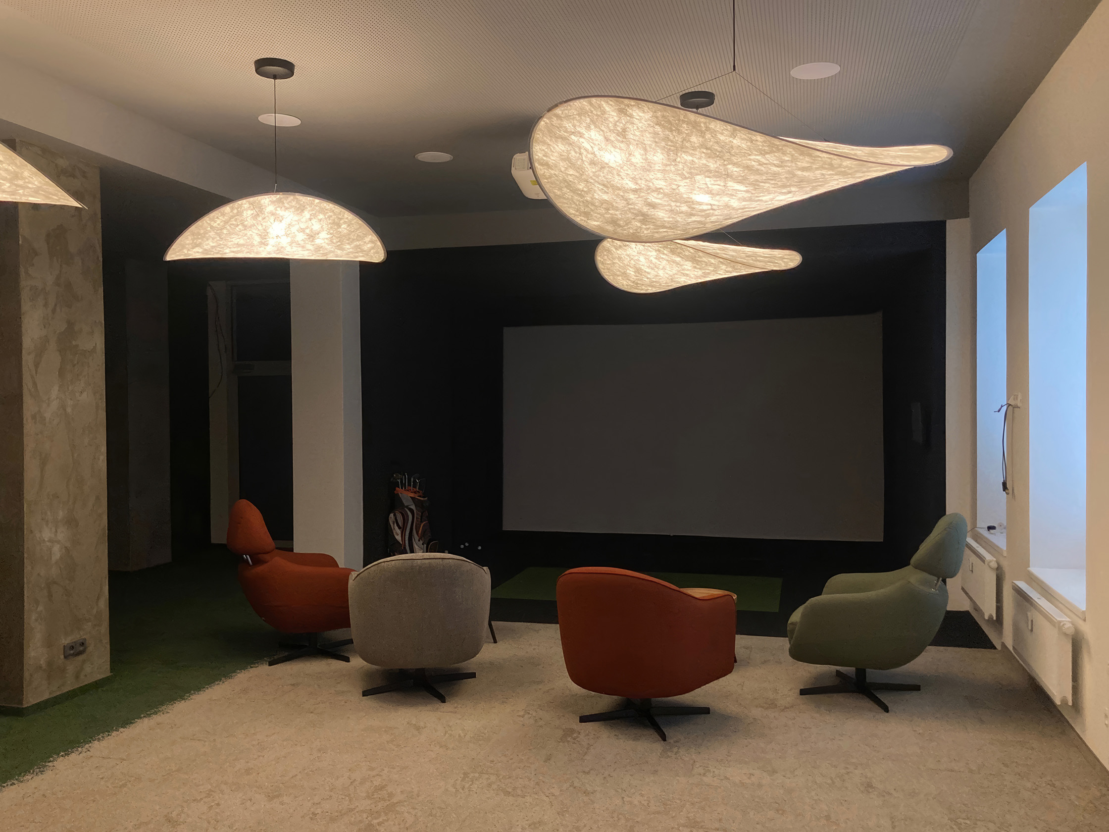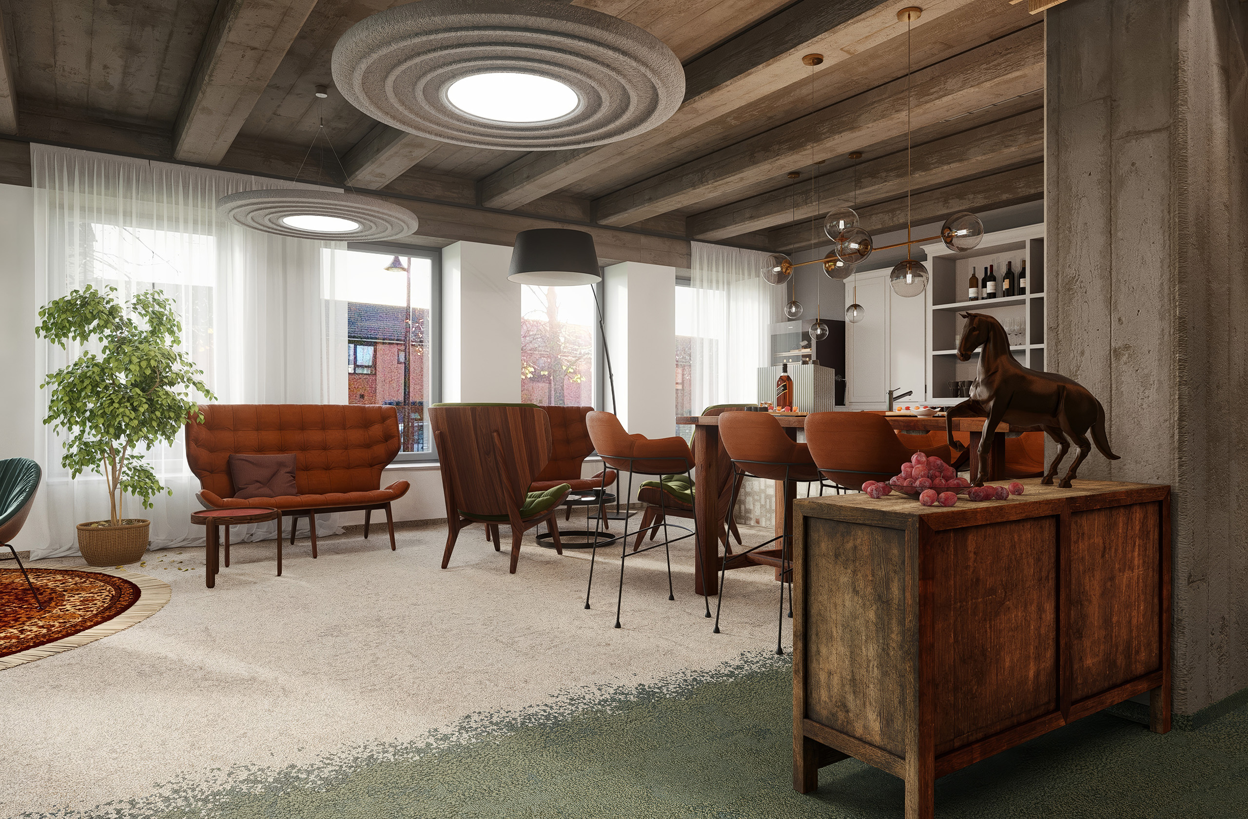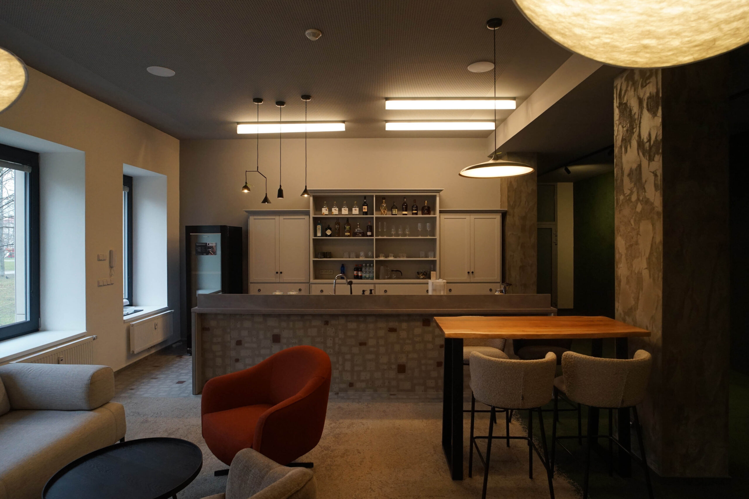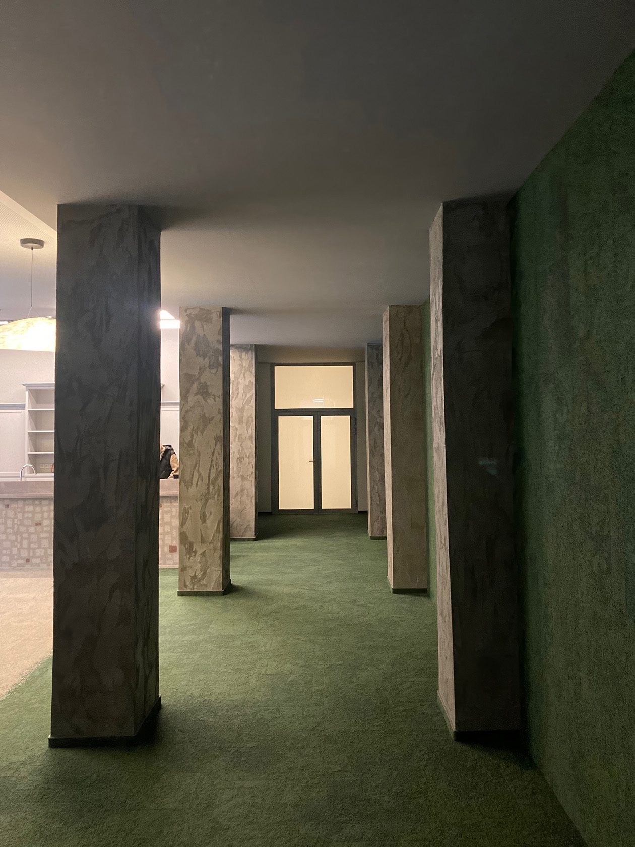 Koberce evokující zelený trávník, klubové posezení, měkké osvětlení a zdobnější bar, zůtulňují industriální prostory s betonovými podhledy a sloupy.