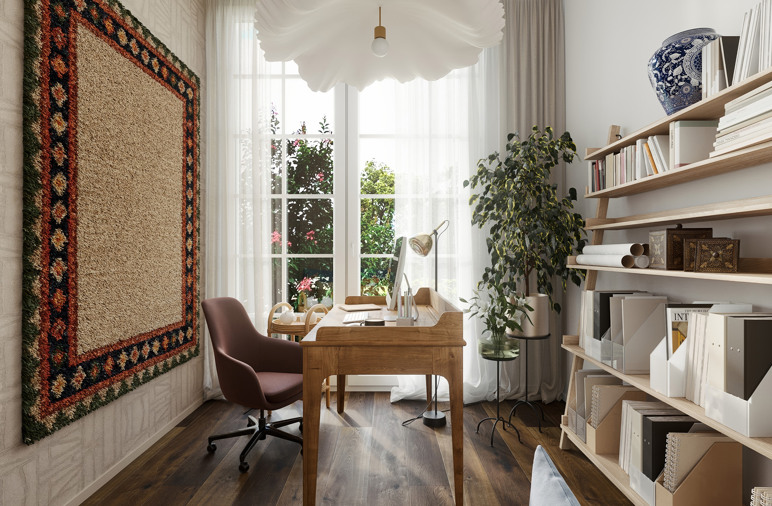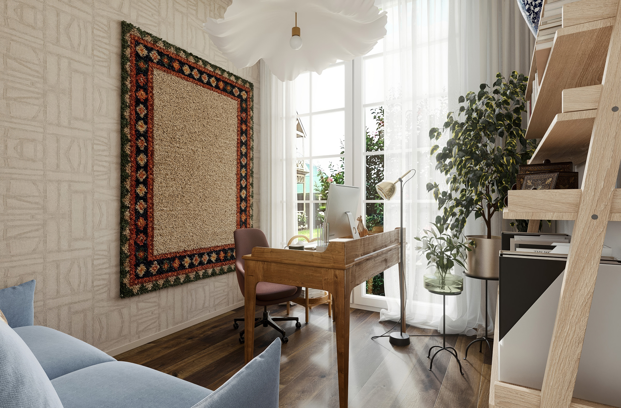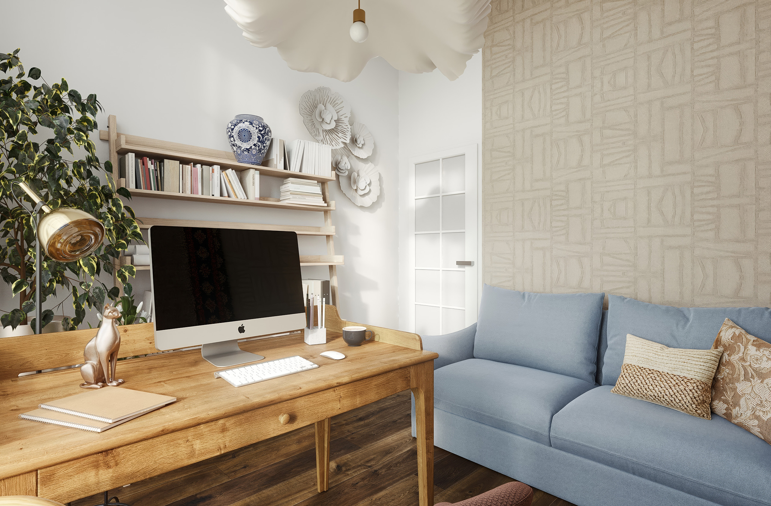 Tapeta s etnickým vzorem s látkovou strukturou celý prostor zútulní. Zbytek pak už jen dozdobí dřevěný masivní pracovní stůl, lehký policový systém a modrá rozkládací pohovka, pro příležitostné přespání hostů…