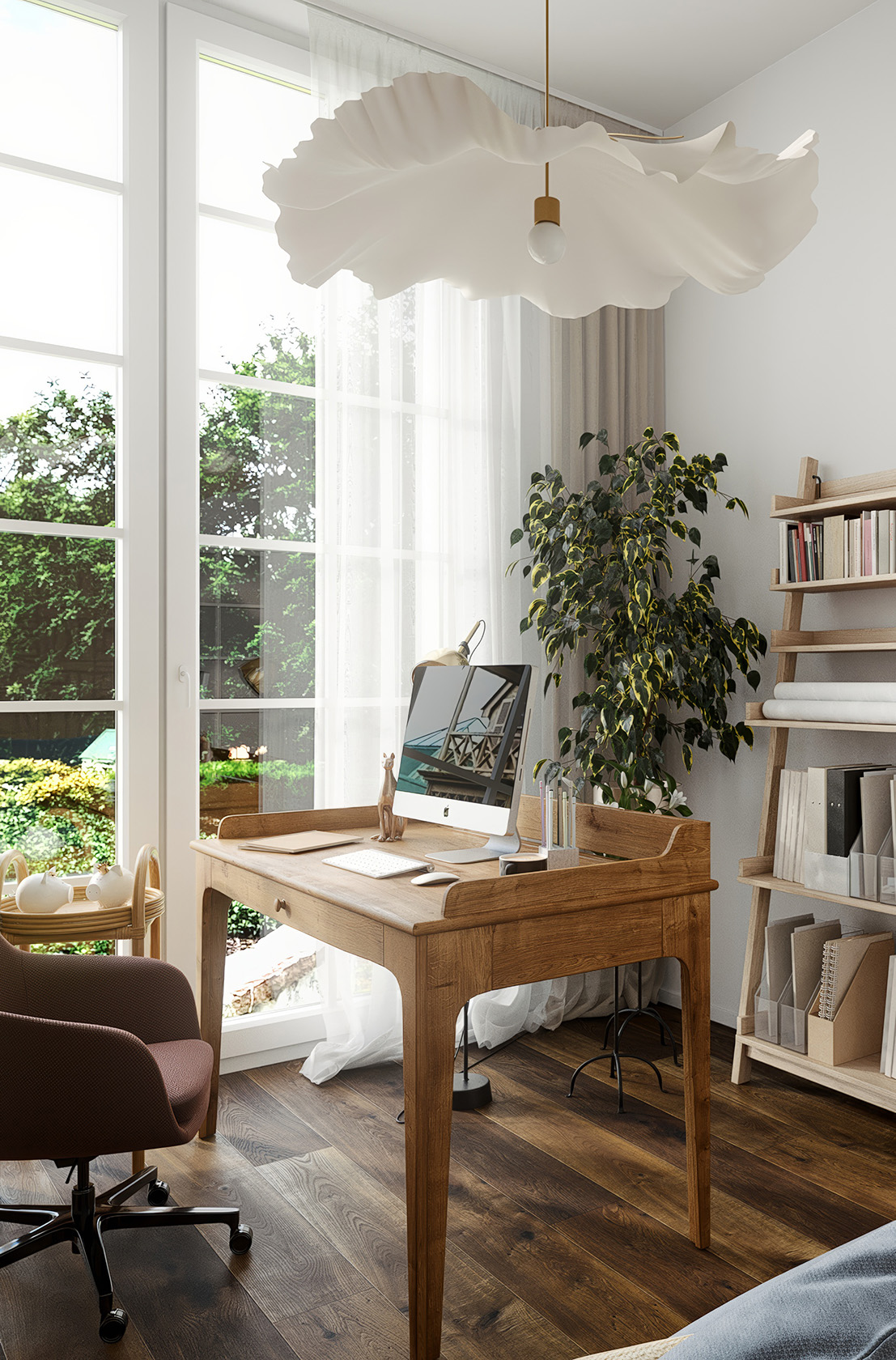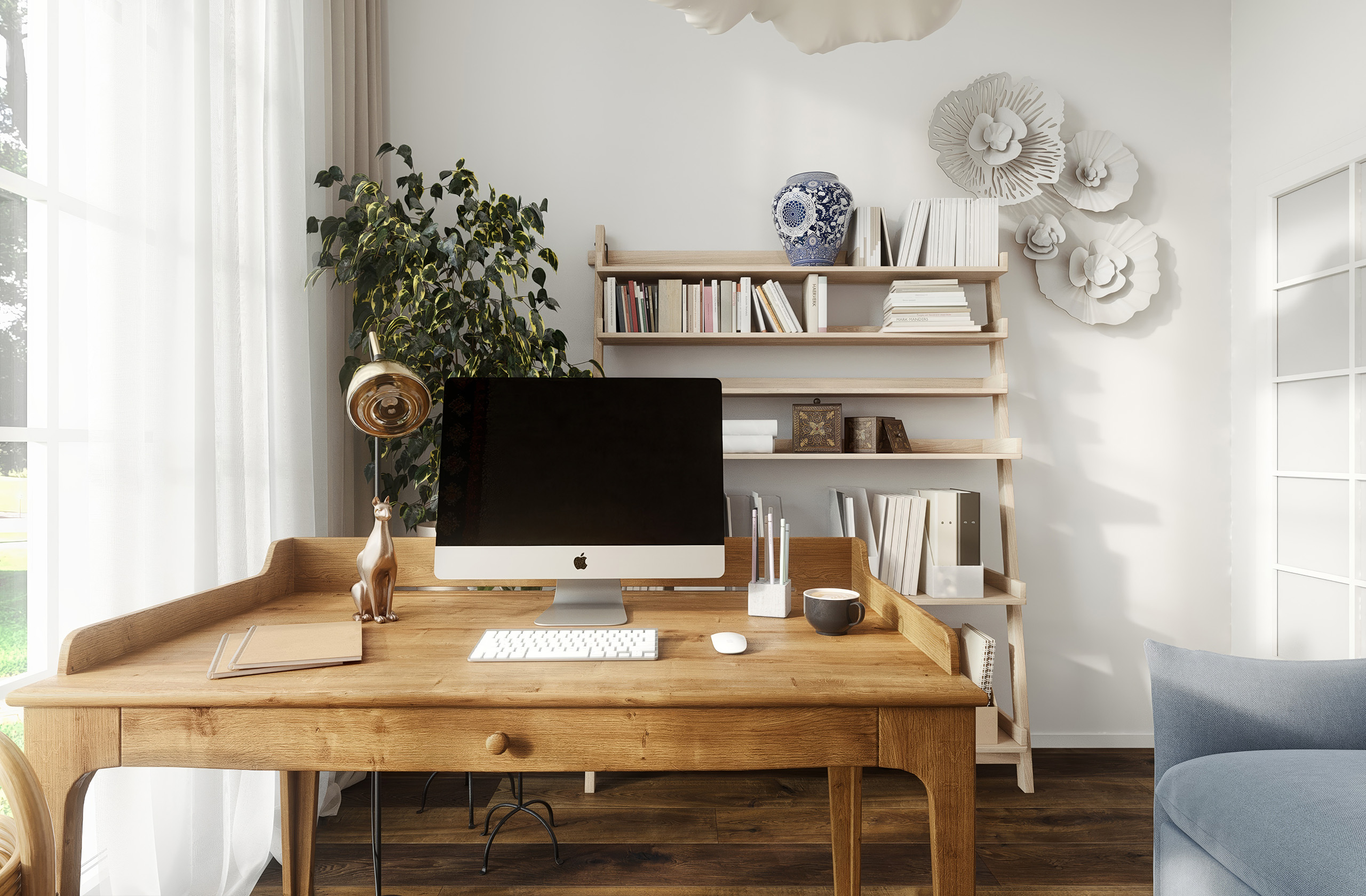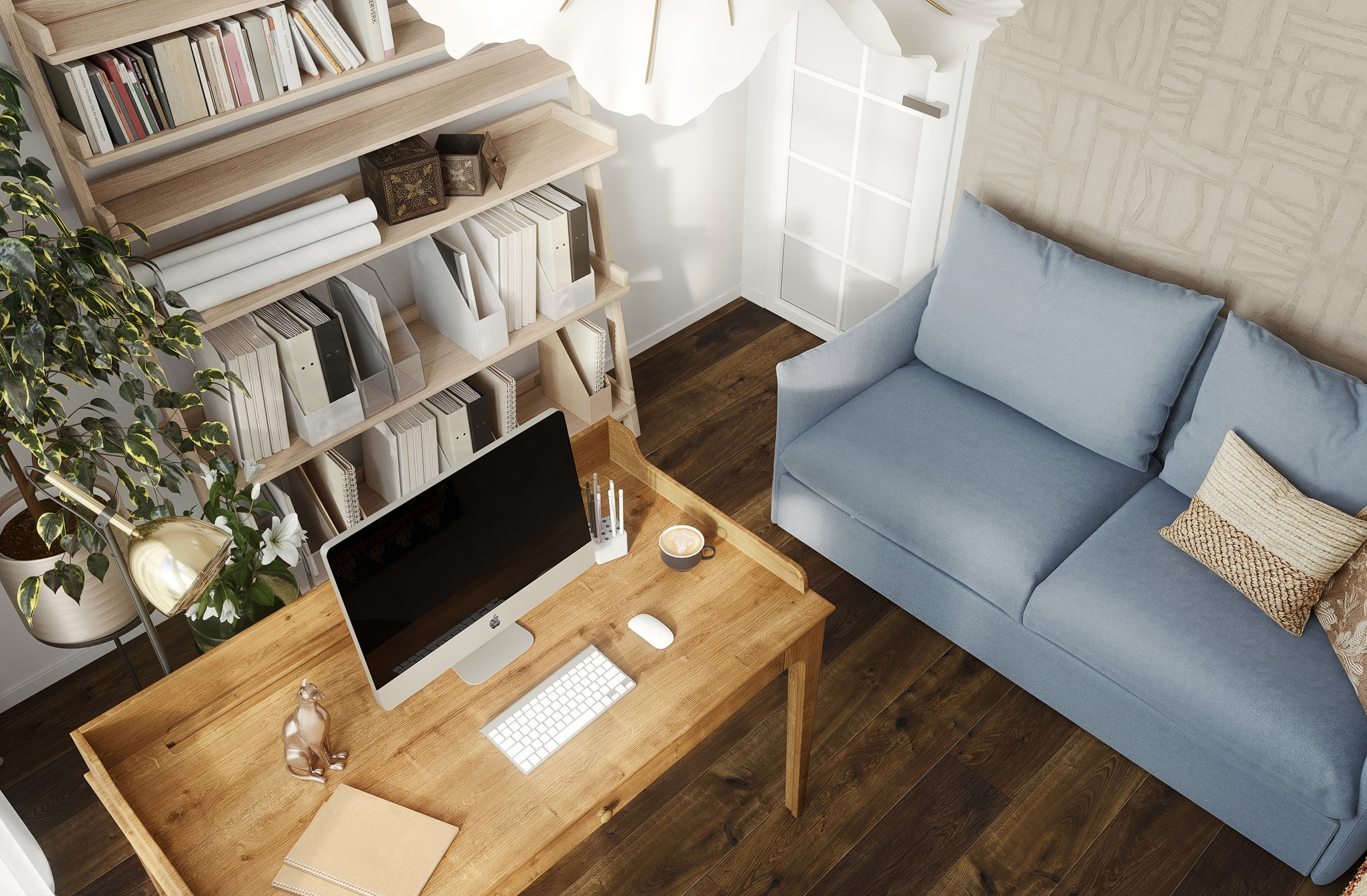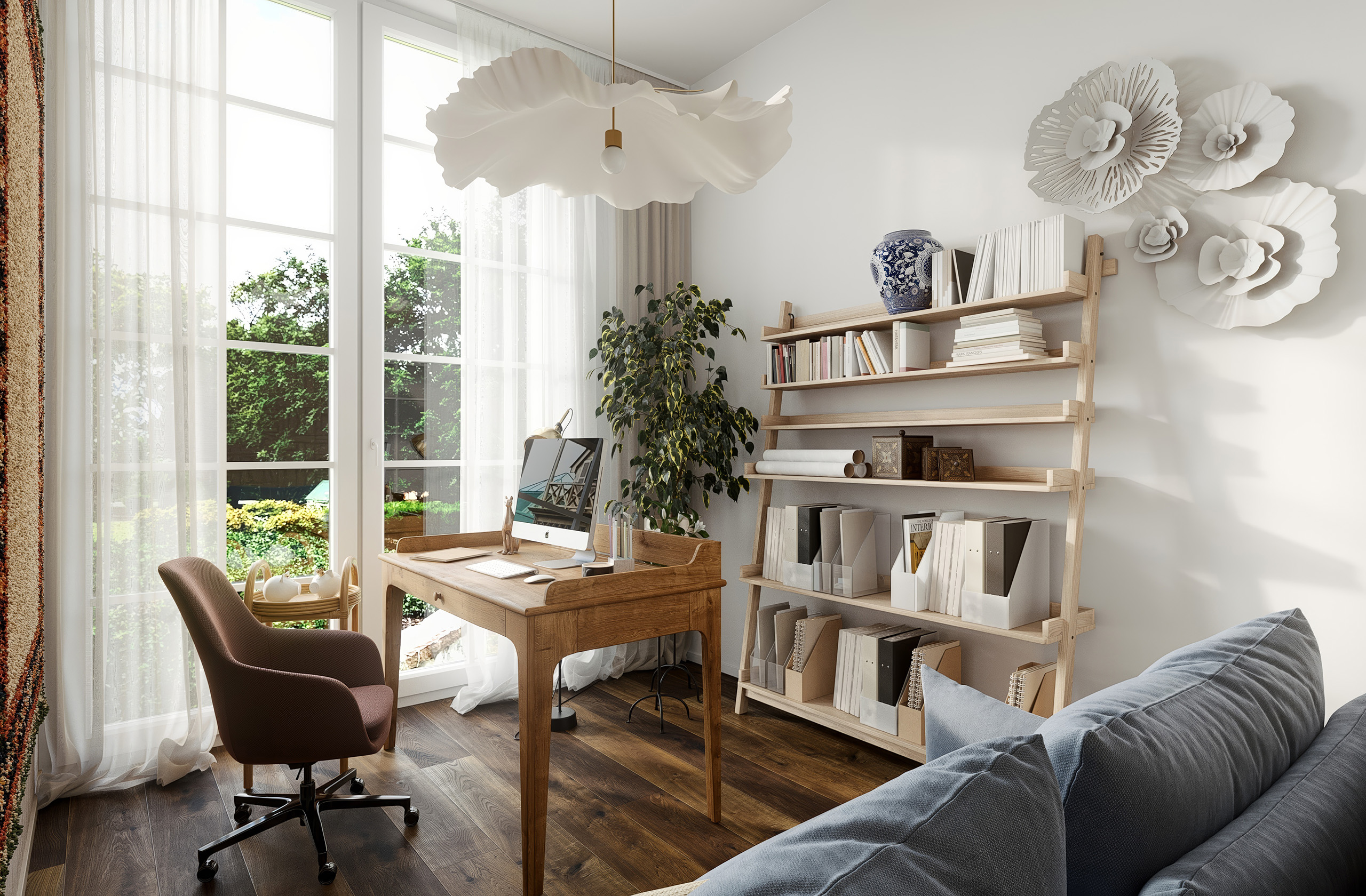 Tapeta s etnickým vzorem s látkovou strukturou celý prostor zútulní. Zbytek pak už jen dozdobí dřevěný masivní pracovní stůl, lehký policový systém a modrá rozkládací pohovka, pro příležitostné přespání hostů…