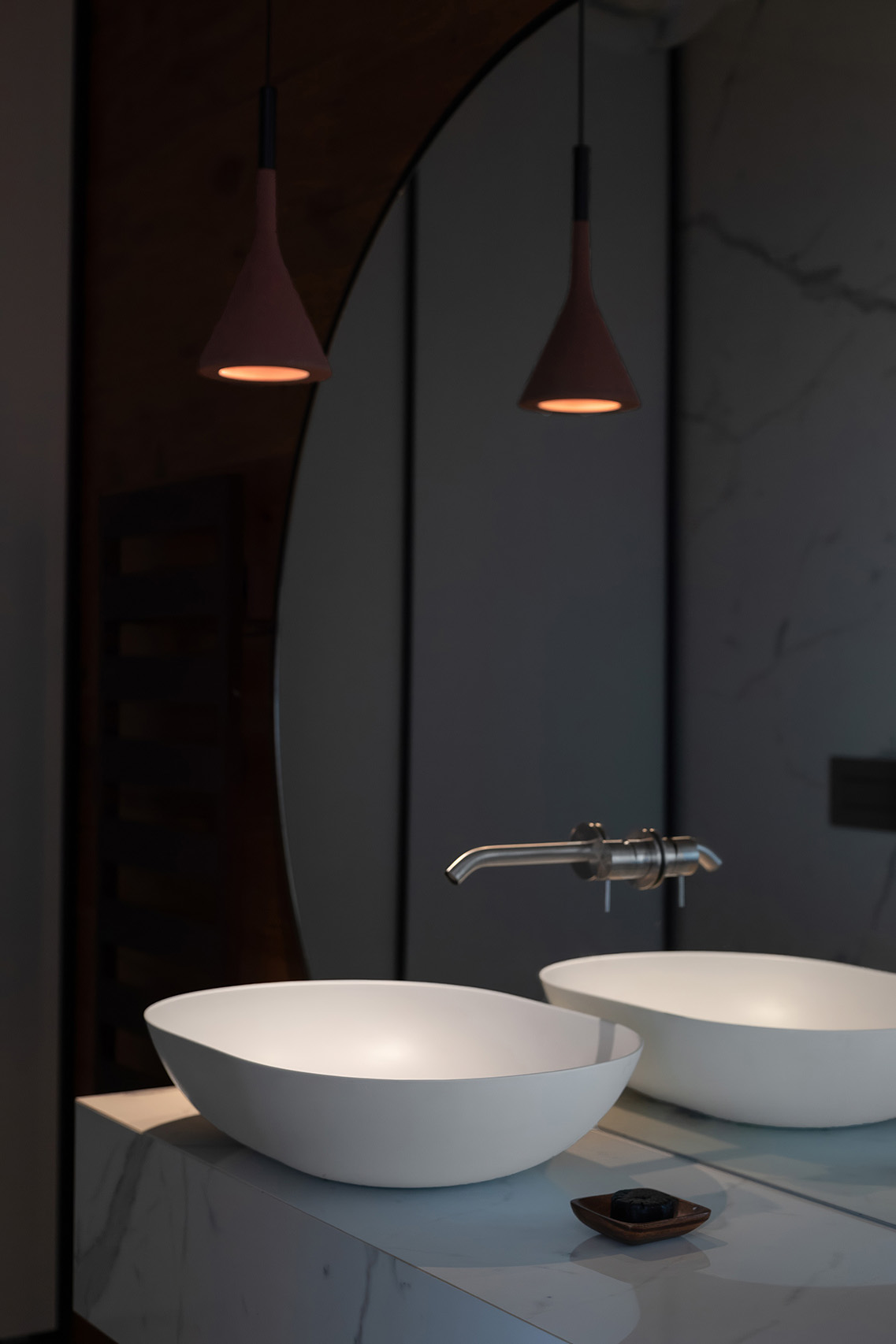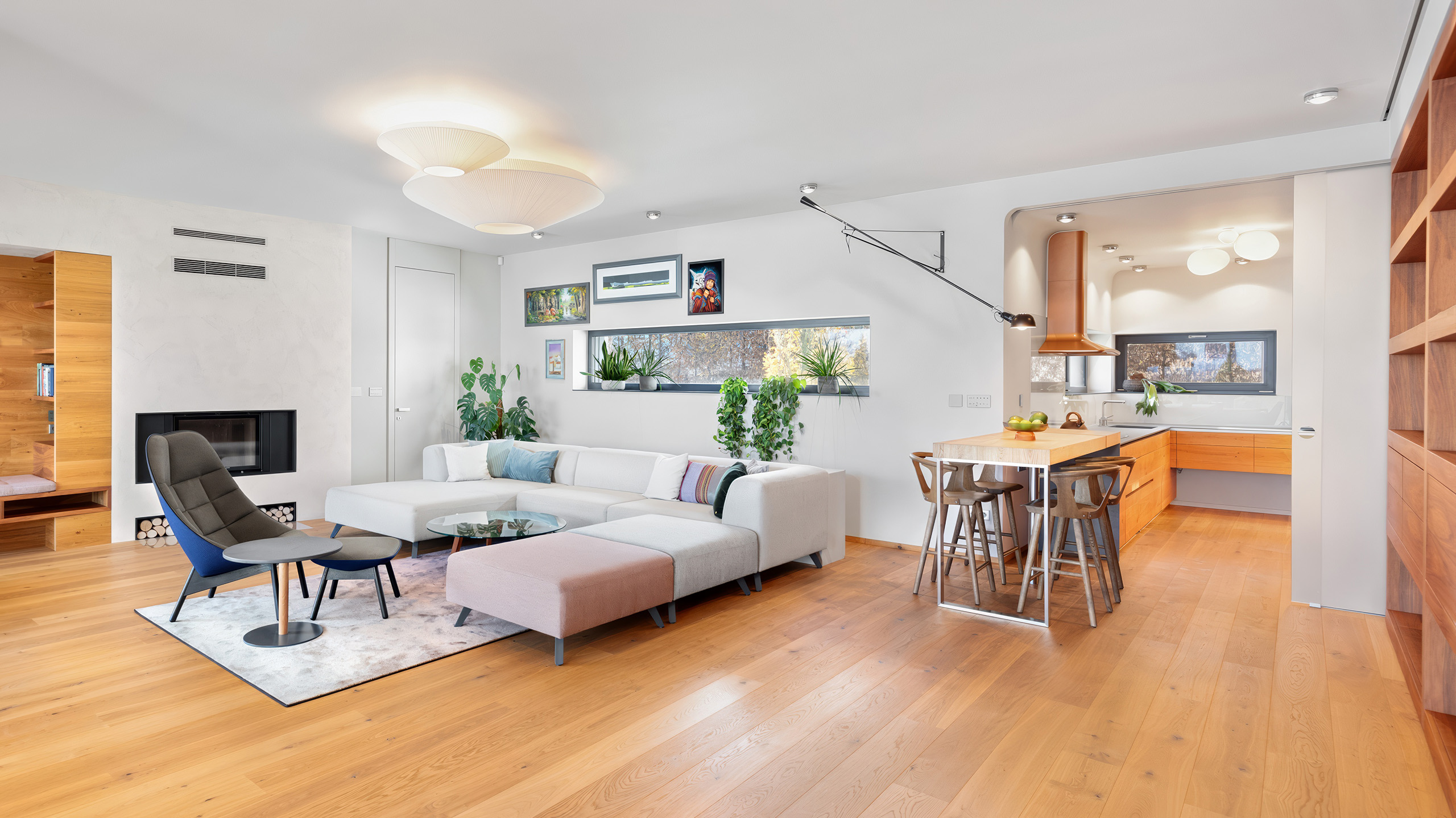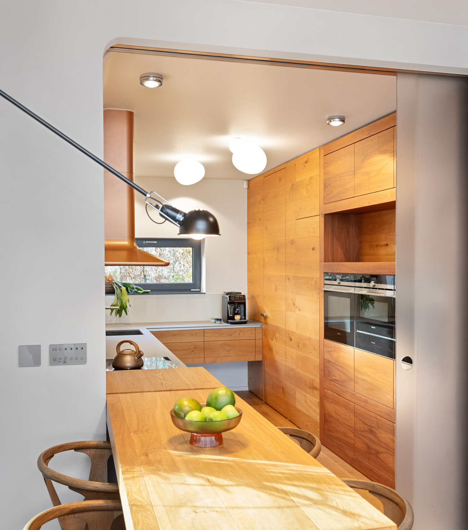 Majitel si přál jednoduchost a praktičnost. Podmínkou bylo vytvořit malou kuchyň, kterou bude možno samostatně oddělit od zbylého prostoru. Dřevěná masivní podlaha je základem, který byl použit i na další části nábytku, dveře a obložení stěn. Pak už stačí jen vhodně sladit barvy, doladit materiály a vybrat krásné osvětlení.
