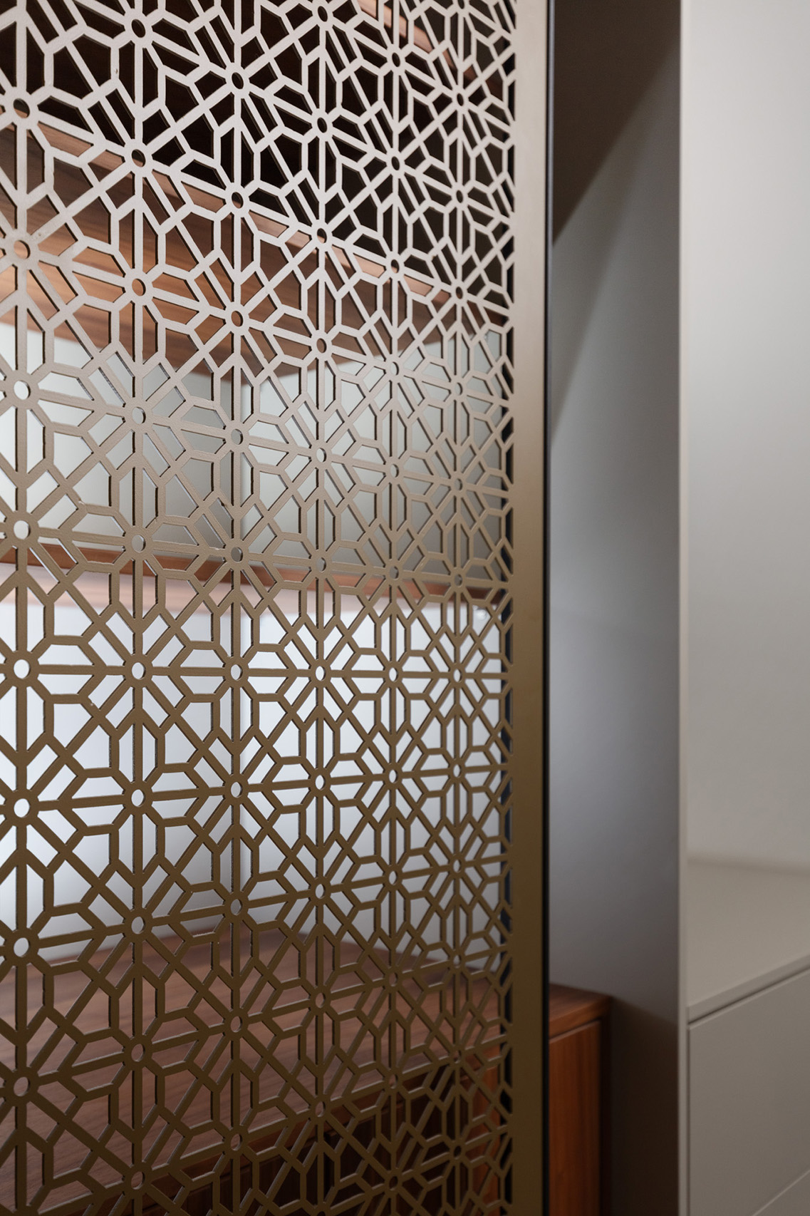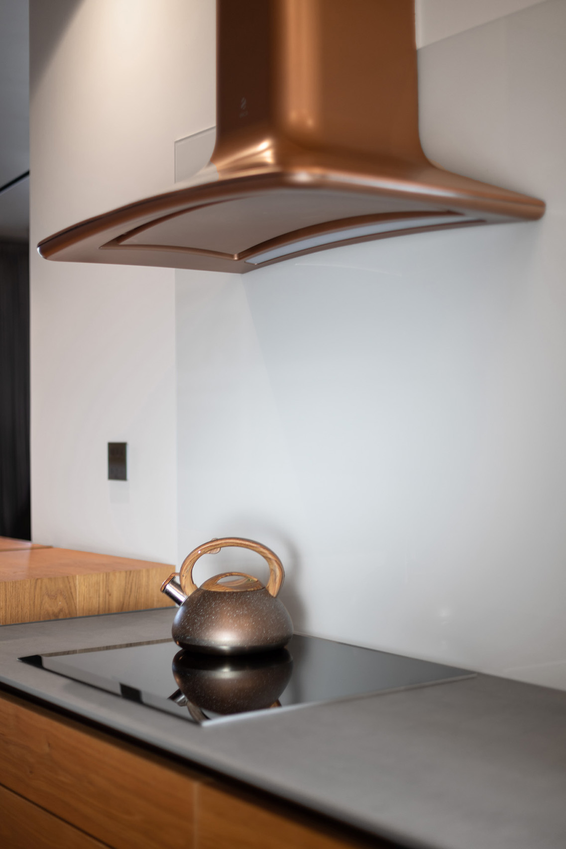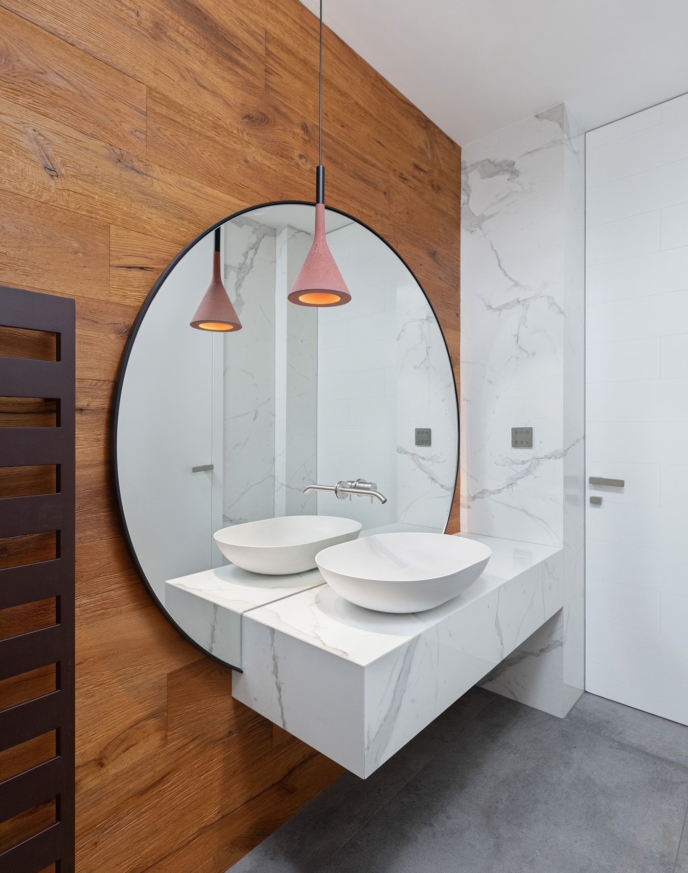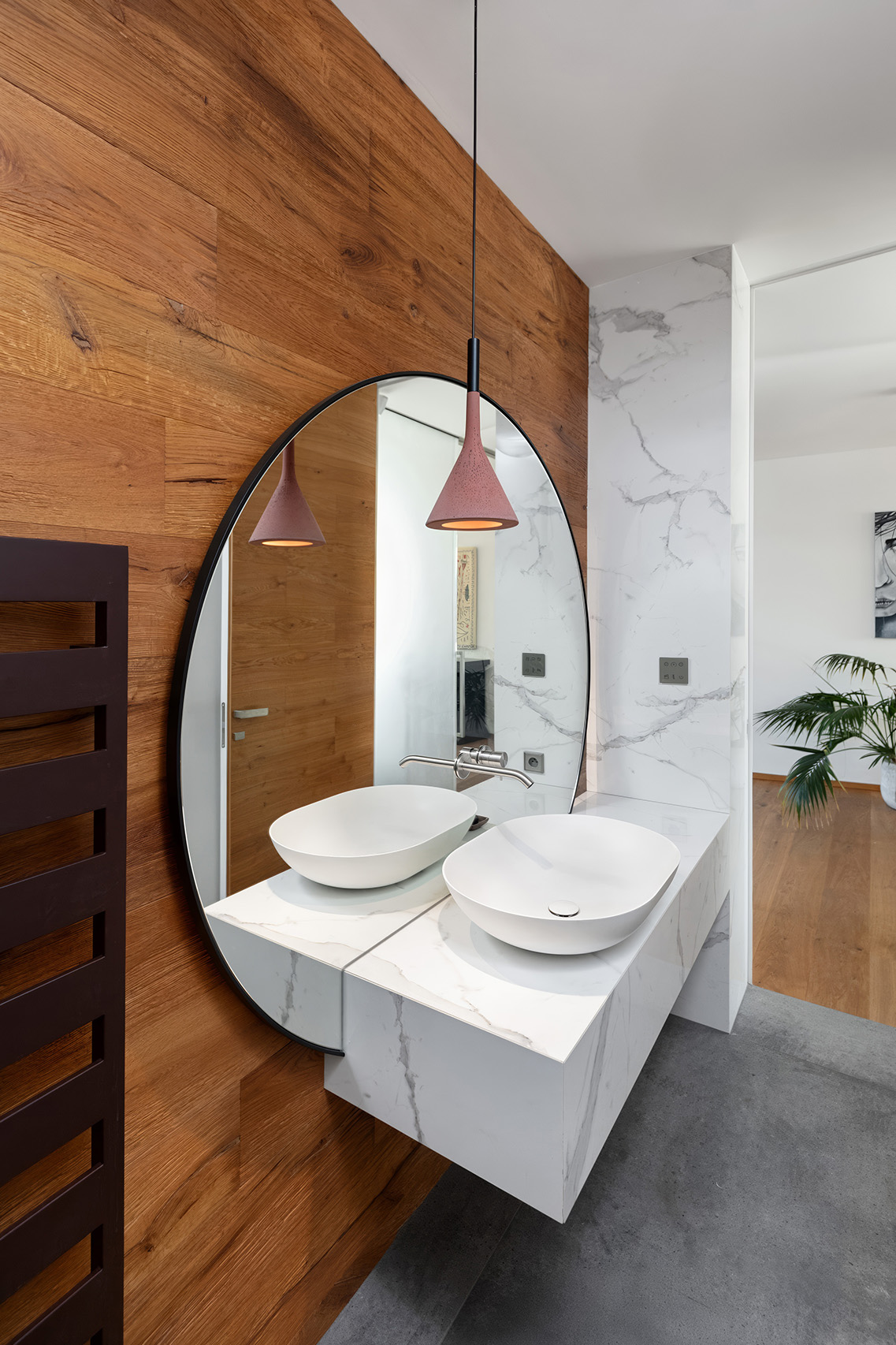 Majitel si přál jednoduchost a praktičnost. Podmínkou bylo vytvořit malou kuchyň, kterou bude možno samostatně oddělit od zbylého prostoru. Dřevěná masivní podlaha je základem, který byl použit i na další části nábytku, dveře a obložení stěn. Pak už stačí jen vhodně sladit barvy, doladit materiály a vybrat krásné osvětlení.