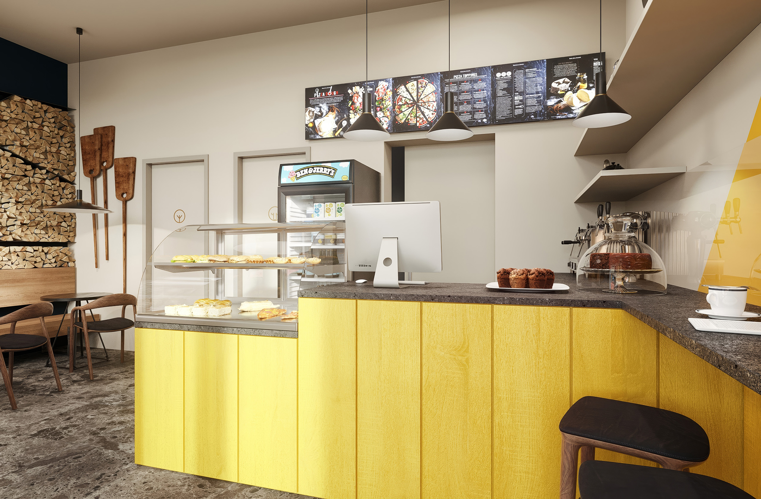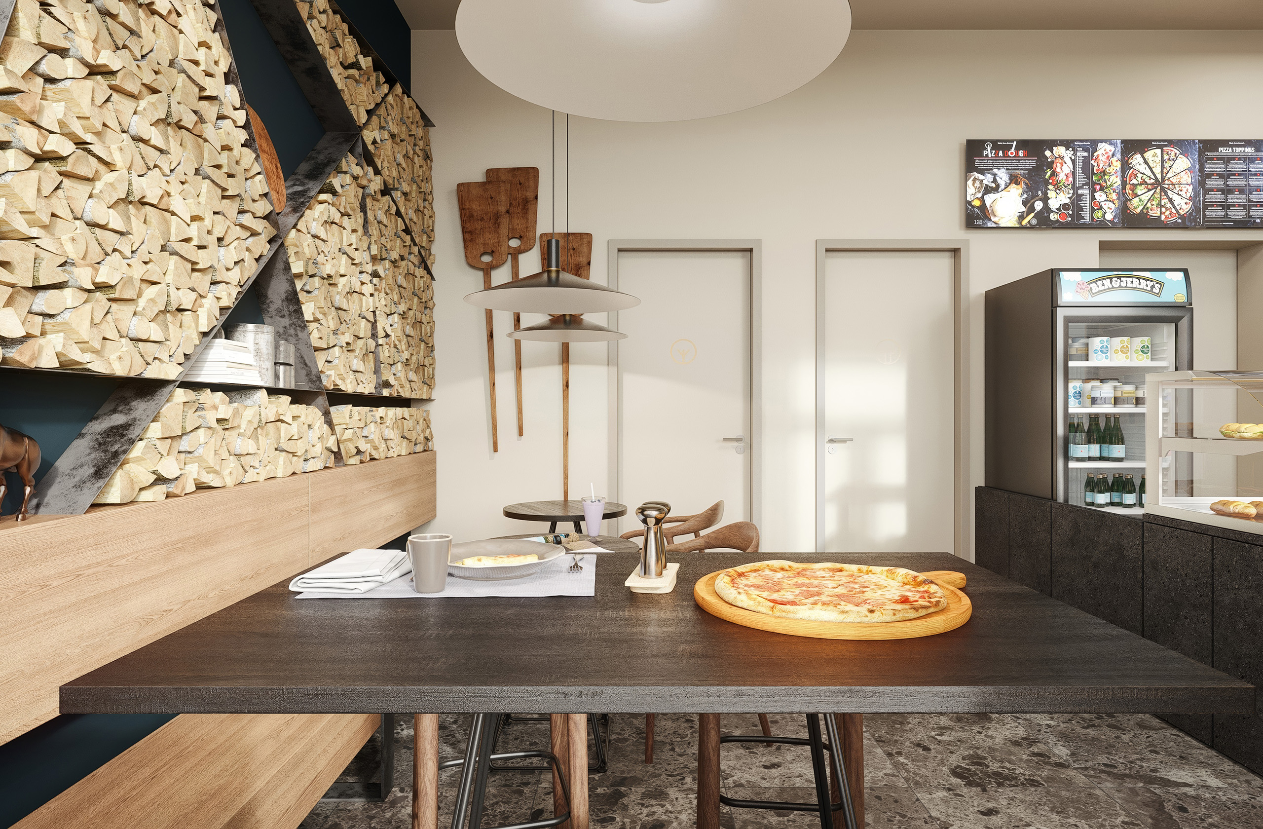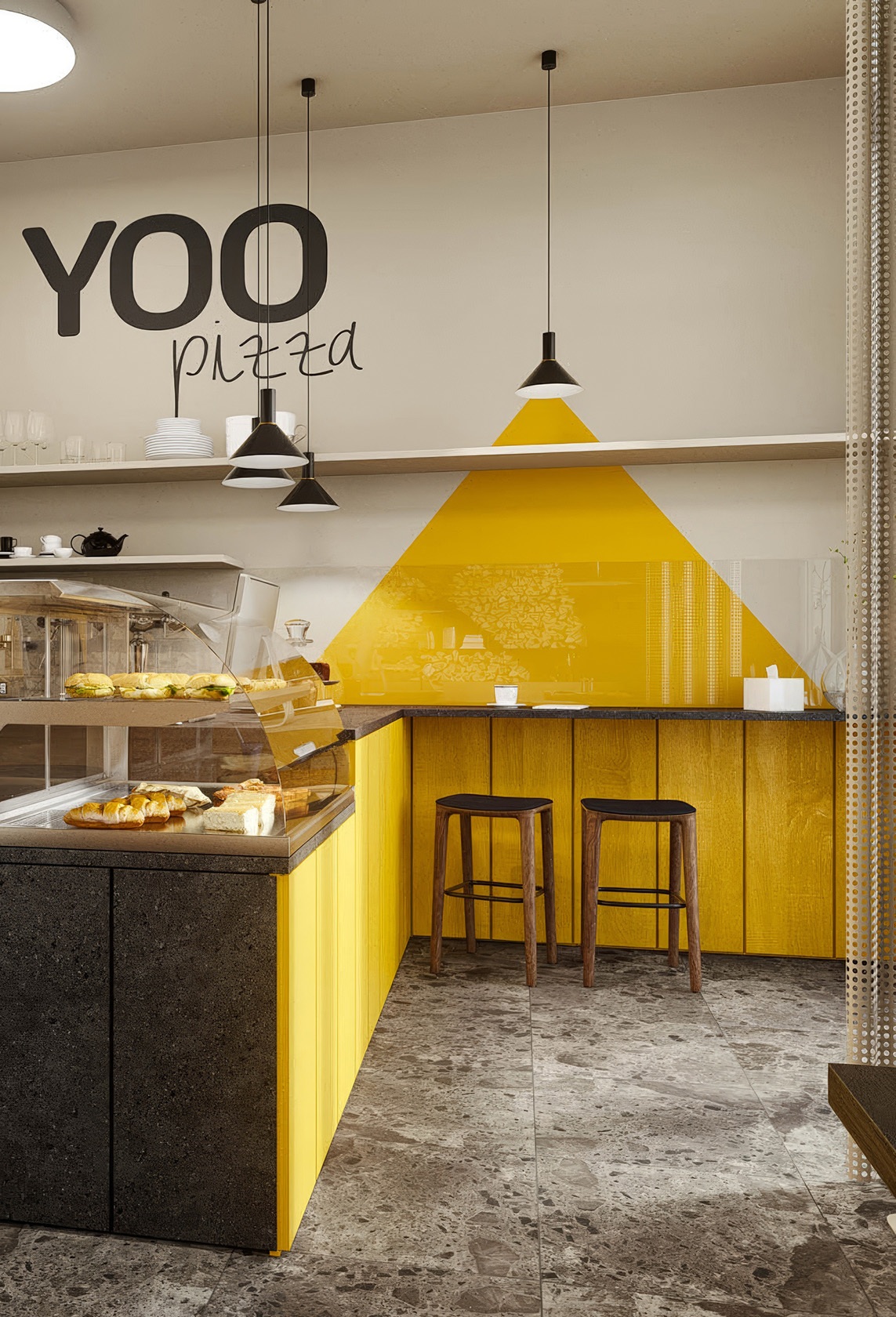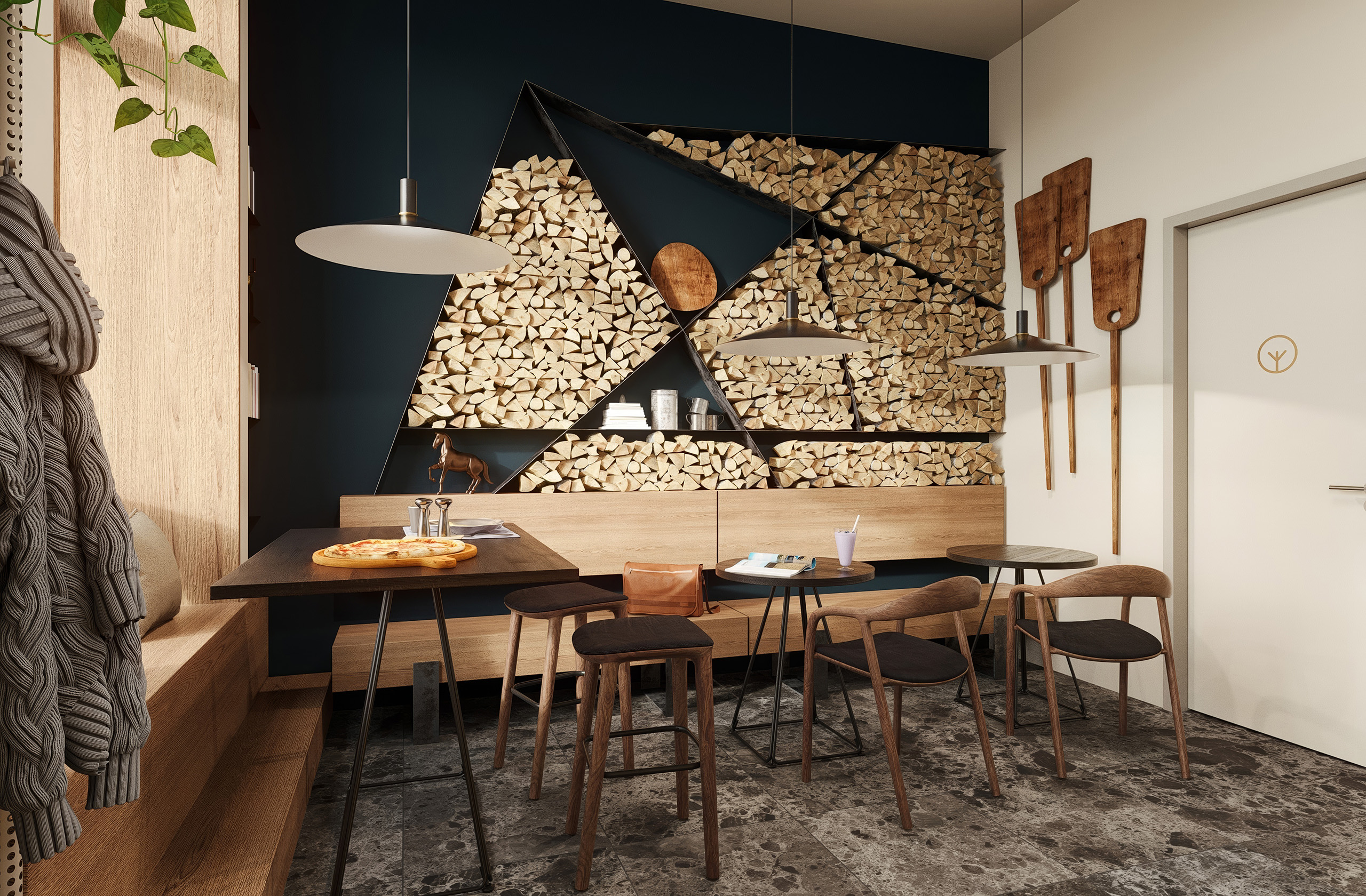 Návrh pizzerie v centru města. Malý prostor zútulnily tmavší odstíny barev. Dřevo a kamenná dlažba vyvážila sytost žluté, která byla v začátcích hlavním požadavkem klienta.