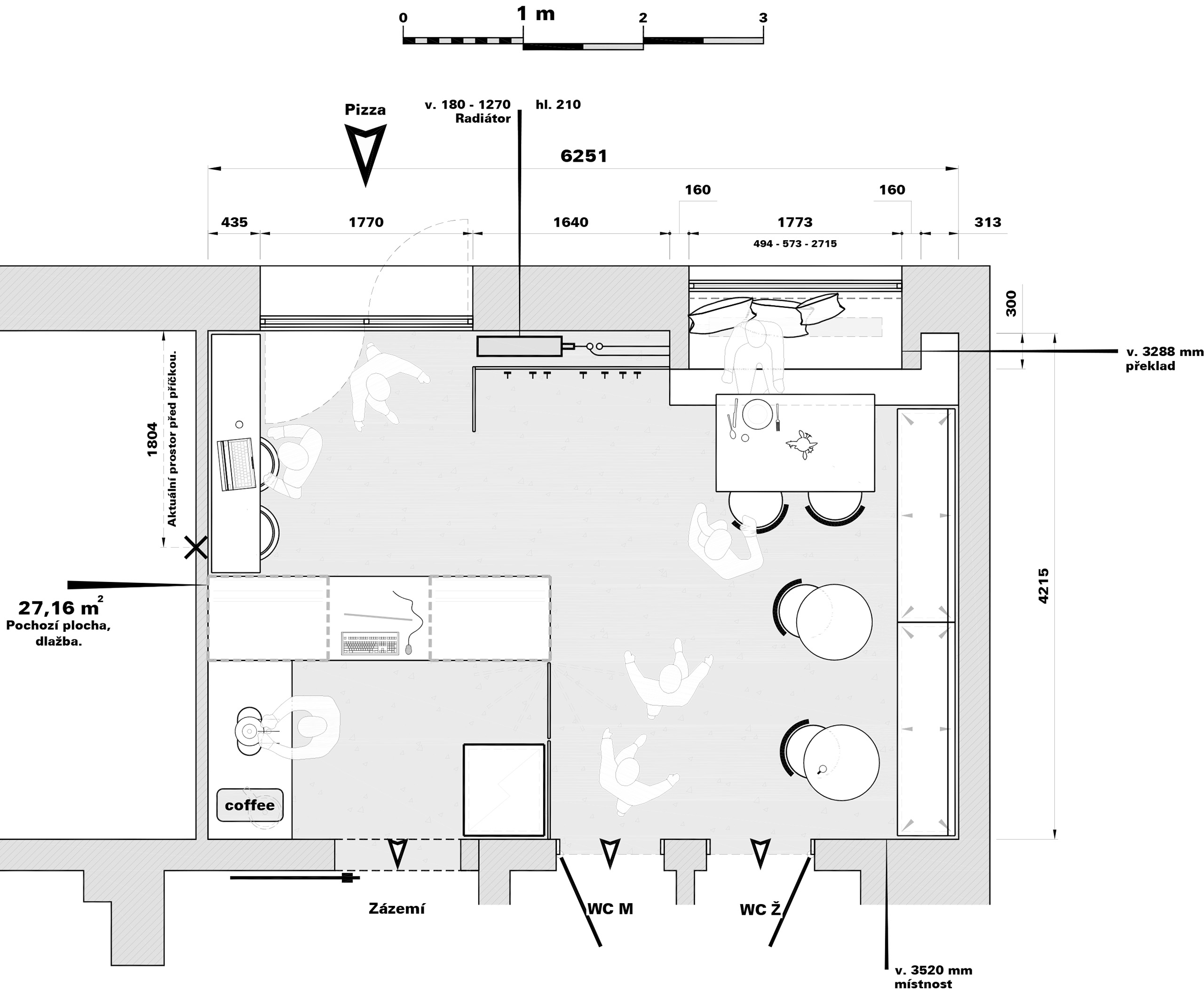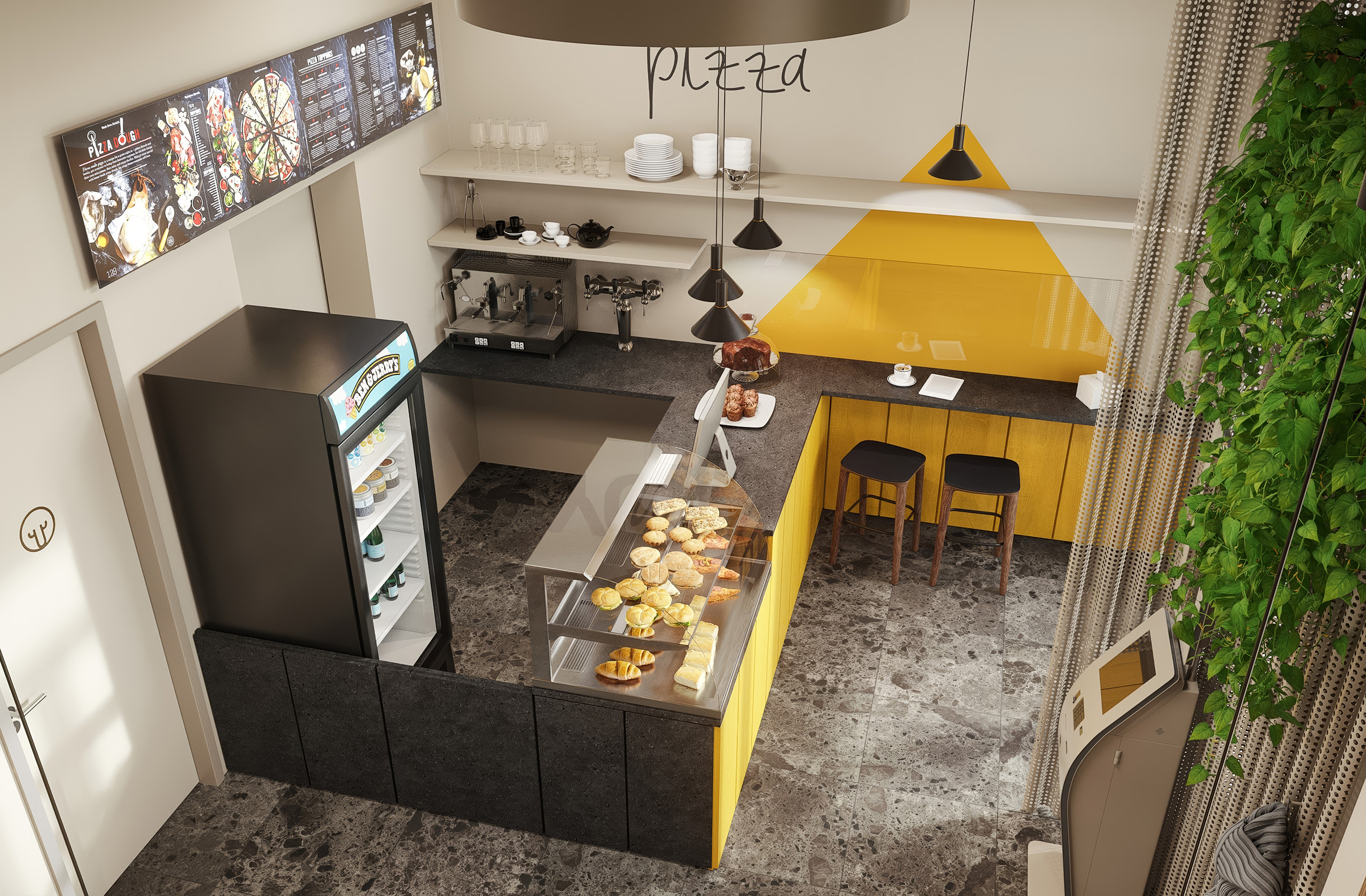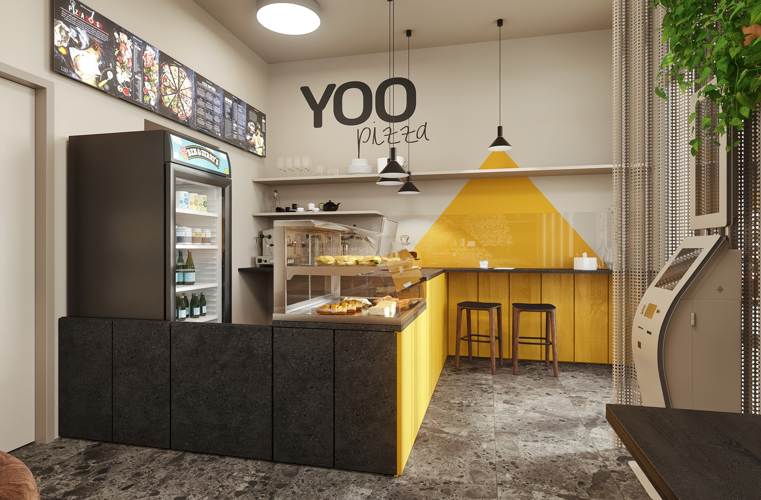 Návrh pizzerie v centru města. Malý prostor zútulnily tmavší odstíny barev. Dřevo a kamenná dlažba vyvážila sytost žluté, která byla v začátcích hlavním požadavkem klienta.