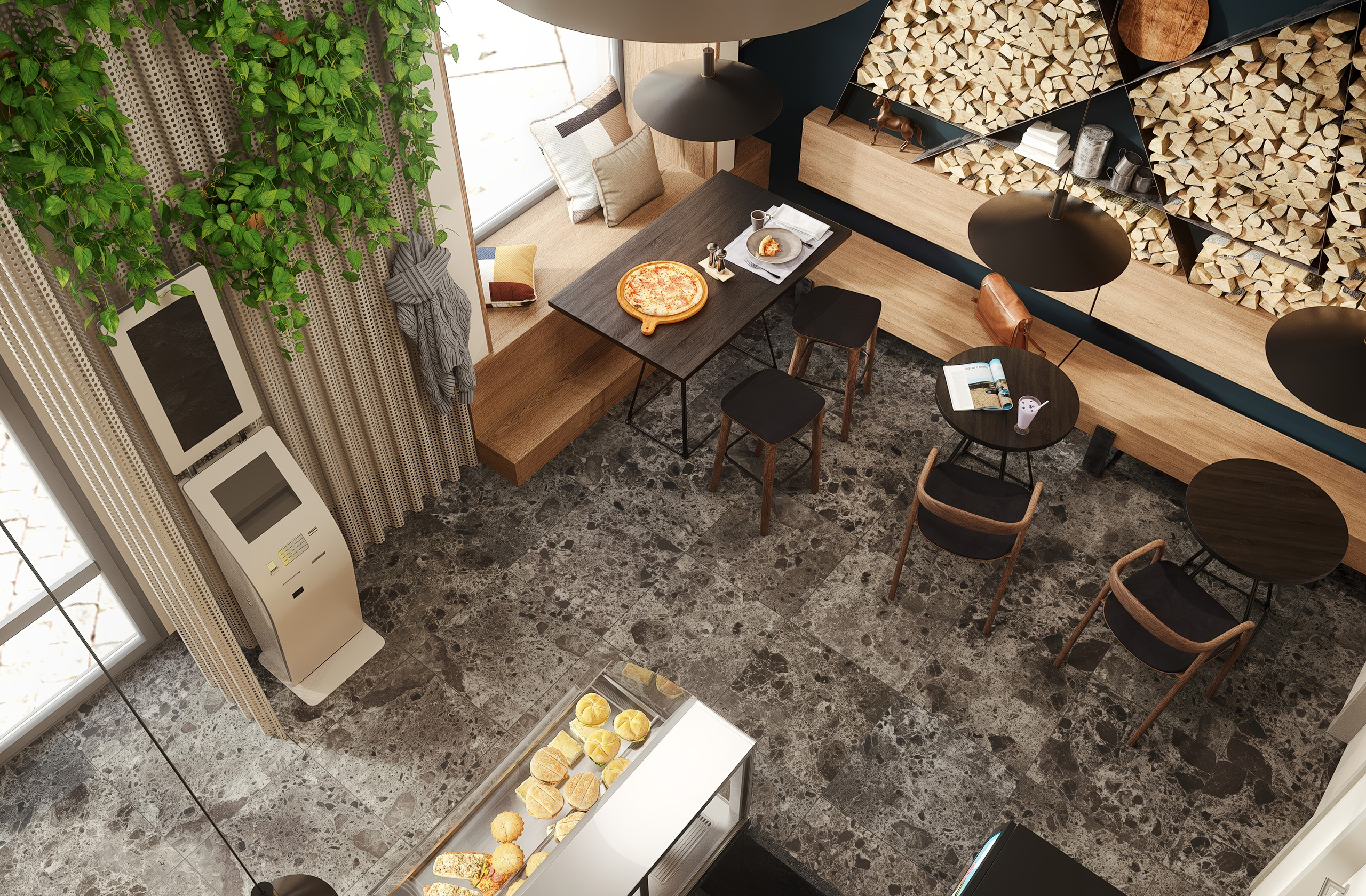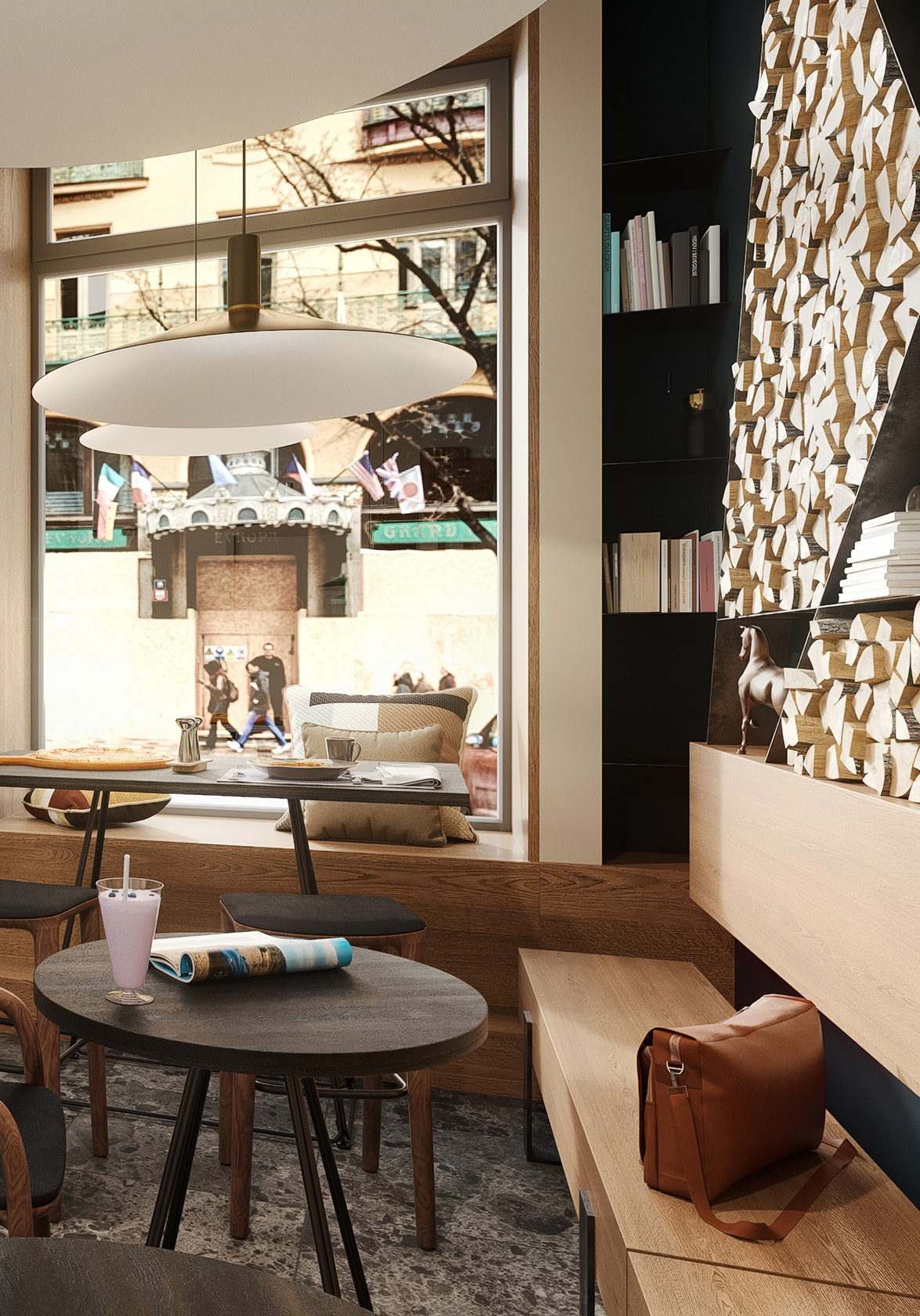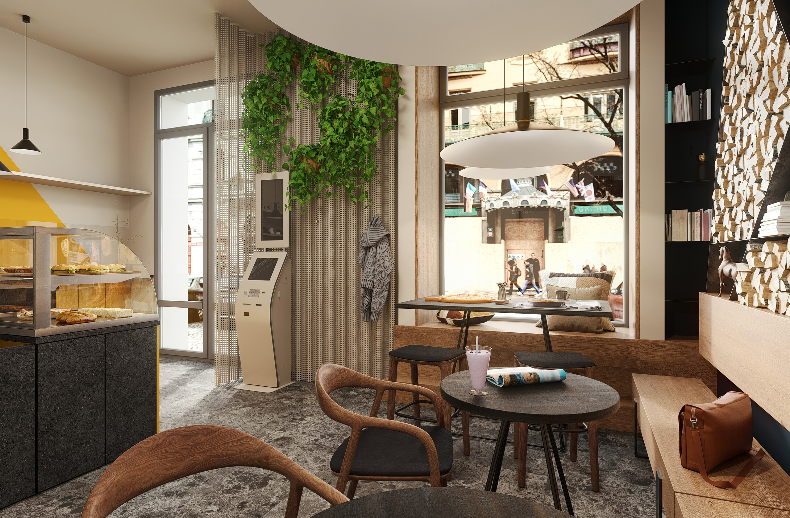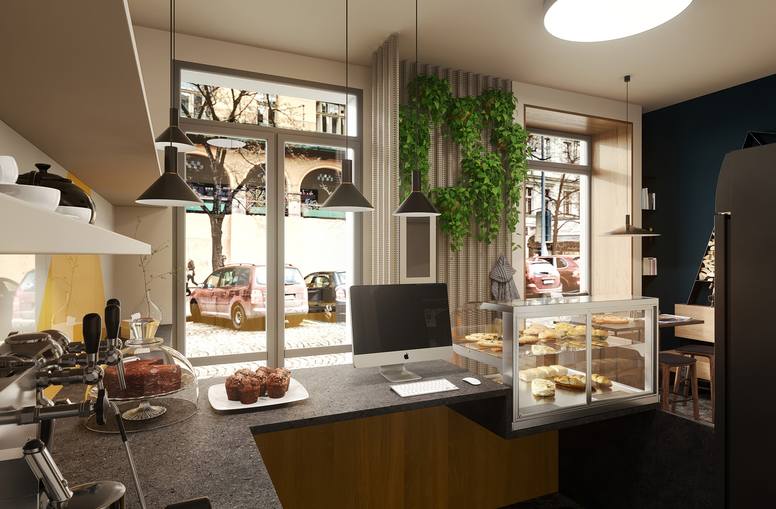 Návrh pizzerie v centru města. Malý prostor zútulnily tmavší odstíny barev. Dřevo a kamenná dlažba vyvážila sytost žluté, která byla v začátcích hlavním požadavkem klienta.